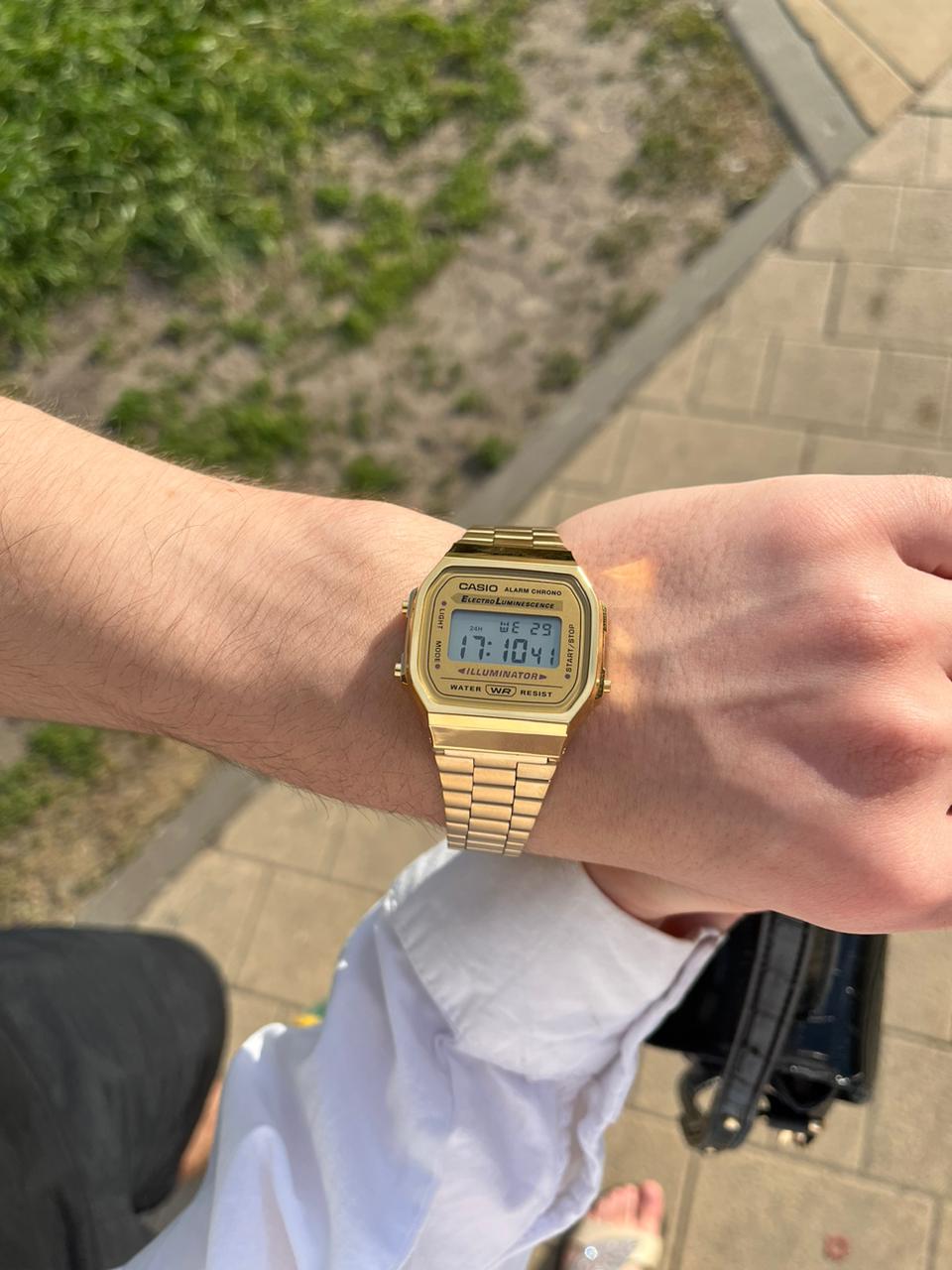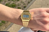 Японские мужские часы с хронографом Casio Vintage A168WG-9WDF (A168WG-9W), кварцевый механизм с высокой точностью. Класс водозащиты: 30 метров, позволит защитить корпус от случайных брызг или капель дождя. Корпус часов изготовлен из пластика, золотистого цвета.