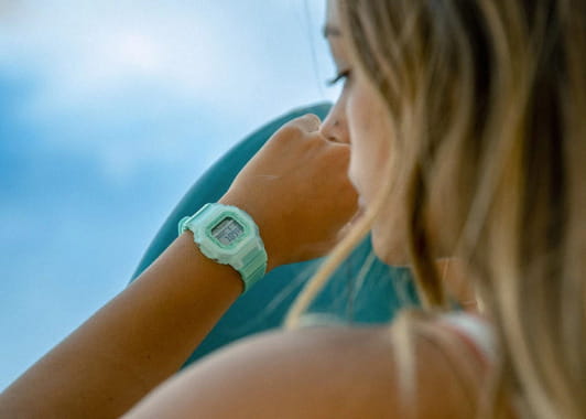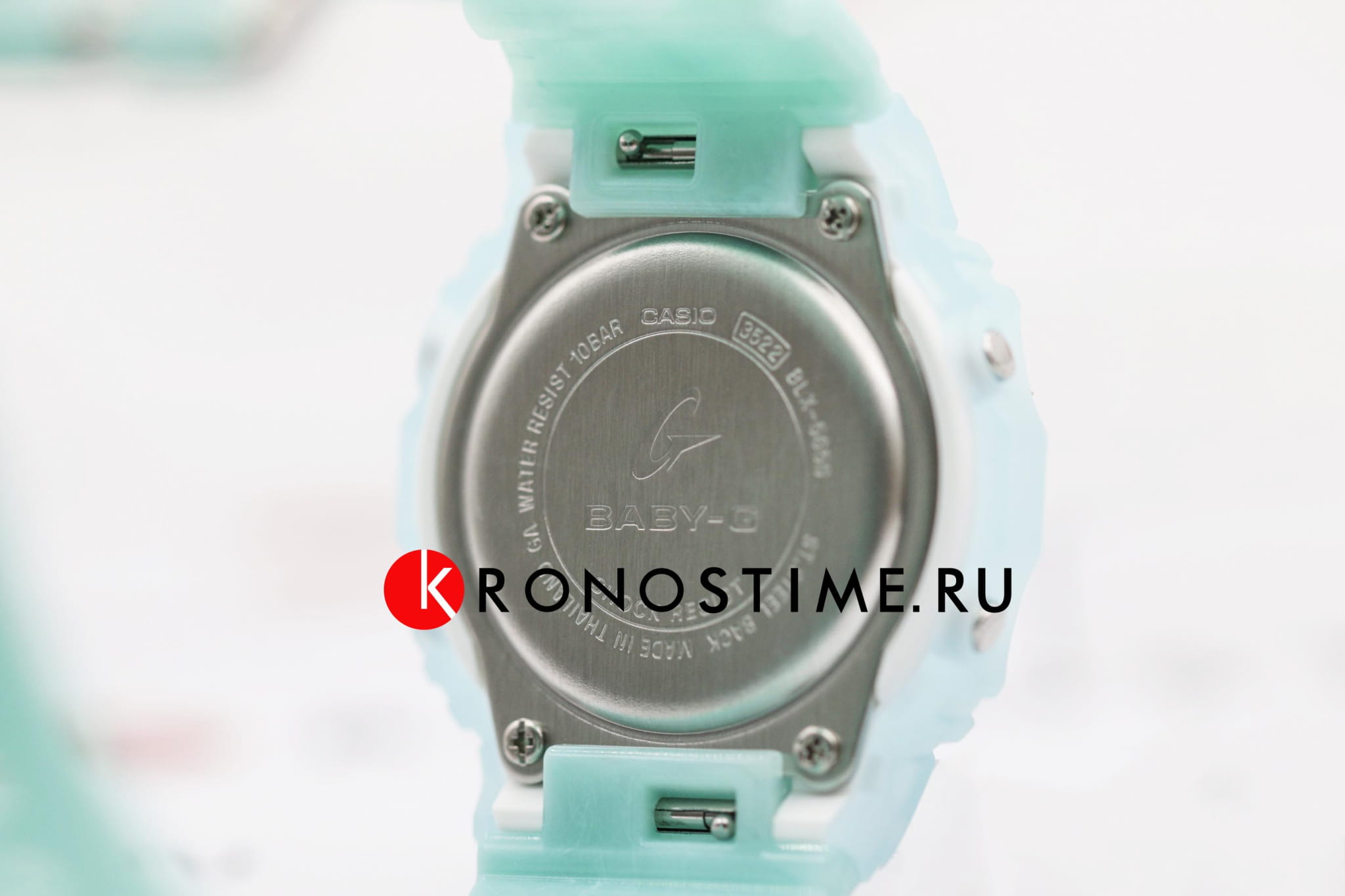 Женские противоударные японские часы с лунным календарем Casio Baby-G BLX-565S-2, кварцевый механизм с высокой точностью. Класс водозащиты: 100 метров, позволит плавать, нырять и заниматься другими водными видами спорта. Корпус часов изготовлен из пластика бирюзовацвета. Ударопрочный корпусУдаропрочный корпусМеханизм заключён в корпус, выполненный из современных материалов, устойчивых к ударам, механическим повреждениям и падению с высоты: инновационный пластик, карбон, нержавеющая сталь, титан. защищает механизм от ударов и вибрации. Светодиодная подсветкаСветодиодная подсветкаСветодиодная или LED-подсветка обеспечивает появление яркого холодного свечения за счёт LED-элементов - маленьких лампочек. Они потребляют минимальное количество энергии, чаще всего можно встретить 1 светодиод, в нижней части циферблата. освещает весь циферблат, после отпускания кнопки свечение продолжается еще некоторое время. Особенность модели в функциях будильникаБудильникБуди́льник — часы, в заданный момент времени подающие звуковой, световой и/или в редких случаях другой сигнал., секундомераСекундомерСекундоме́р — прибор, способный измерять интервалы времени с точностью до долей секунды., таймера и мирового времениМировое время Полезное часовое усложнение, отображающее время в основных городах и известных областях по всему миру, оно связано с часовыми поясами, удобно для путешественников и бизнесменов. .
