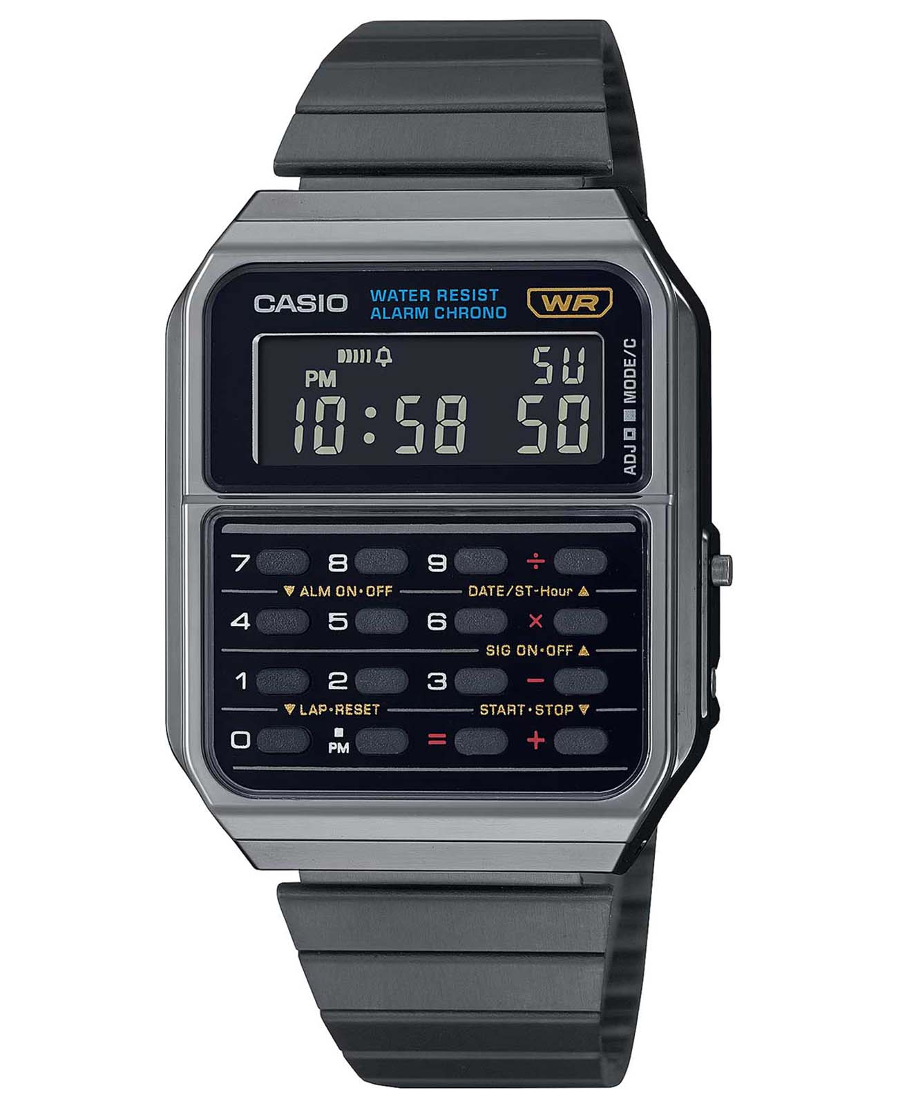 Японские унисекс часы с хронографом Casio Vintage CA-500WEGG-1B, кварцевый механизм с высокой точностью. Корпус часов изготовлен из пластика, серебристого цвета. Светодиодная подсветкаСветодиодная подсветкаСветодиодная или LED-подсветка обеспечивает появление яркого холодного свечения за счёт LED-элементов - маленьких лампочек. Они потребляют минимальное количество энергии, чаще всего можно встретить 1 светодиод, в нижней части циферблата., секундомерСекундомерСекундоме́р — прибор, способный измерять интервалы времени с точностью до долей секунды. с точностью измерений 1/100 сек., общее время измерений 24 часа. Будильник с функцией Snooze. Автоматический календарь. 8-ми разрядный калькулятор. Класс водозащиты: 30 метров, позволит защитить корпус от случайных брызг или капель дождя. Браслет из стали с IP-покрытиемIP-покрытиеМетод ионного напыления. Демонстрирует повышенную устойчивость к истиранию, окислению и химическим веществам. Под воздействием высокого давления и температуры около 1500°C молекулы металла надёжно соединяются с частицами корпуса часов. на раскладной застёжкеРаскладная застёжкаТакой тип застёжки используется только на браслетах из металла. Она никогда не раскрывается полностью, происходит разделение на 2 и более частей. Раскладывающая застёжка снизит вероятность потери часов к минимуму.. Калькулятор позволяет производить различные математические вычисления, используя числа, содержащие до 8 знаков.