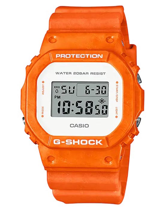 Противоударные японские мужские часы Casio G-Shock DW-5600WS-4D, электронный механизм с высокой точностью. Класс водозащиты: 200 метров, позволит плавать, нырять и заниматься другими водными видами спорта. Корпус часов изготовлен из пластика, оранжевого цвета.