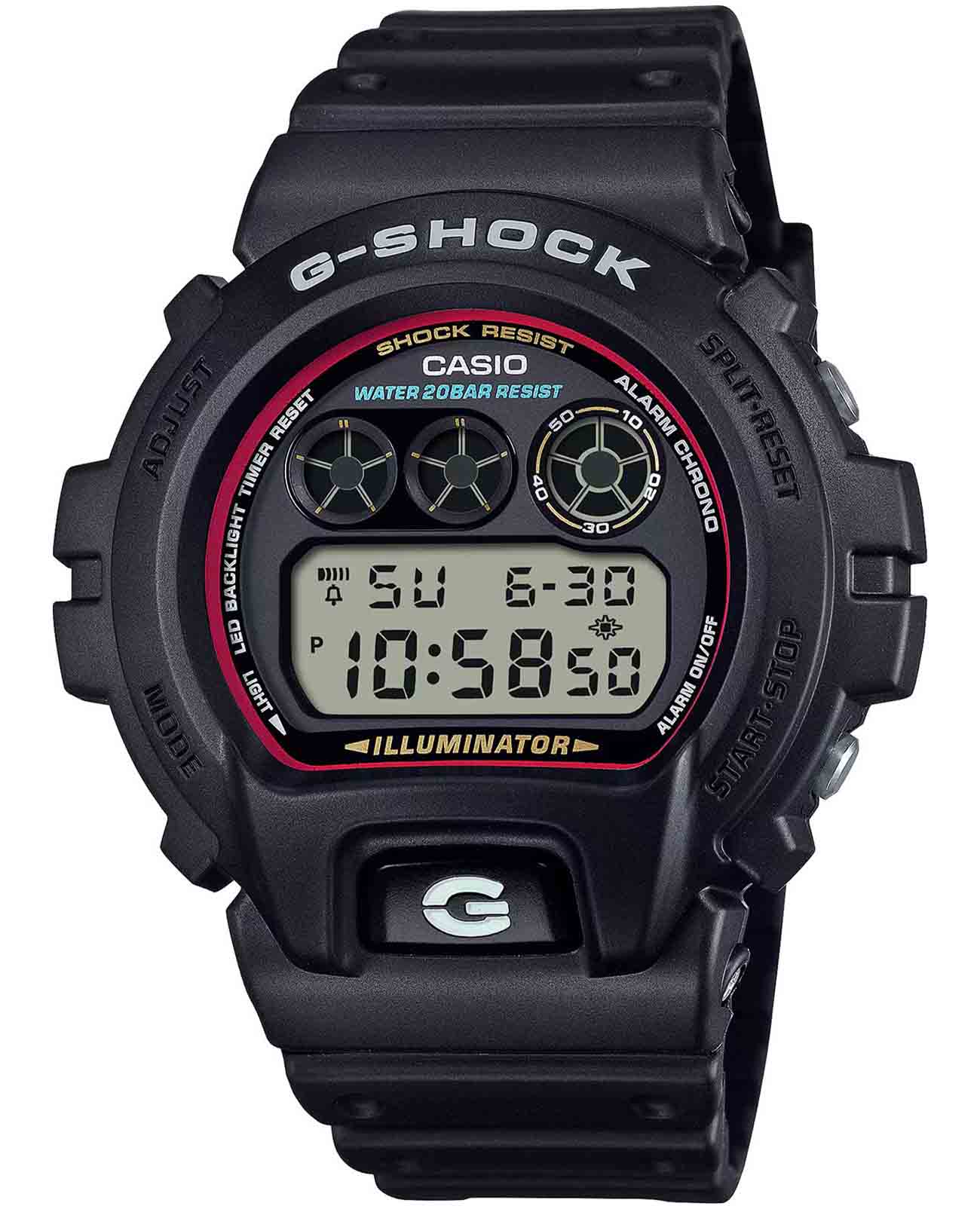 Японские мужские часы Casio G-Shock DW-6900RL-1. В дизайне модели прослеживается визуальная эстетика 90-х годов, что добавляет ей особого шарма в глазах тех, кто помнит первые кассетные плееры SONY и двухкассетники SHARP. Ударопрочный корпусУдаропрочный корпусМеханизм заключён в корпус, выполненный из современных материалов, устойчивых к ударам, механическим повреждениям и падению с высоты: инновационный пластик, карбон, нержавеющая сталь, титан. из полимерного материала защищает механизм от ударов и вибрации. Минеральное стеклоМинеральное стеклоМинеральное стекло представляет собой искусственно выращенный минерал кварца. Такое стекло отличается особой устойчивостью к повреждениям и царапинам. Уступает по некоторым качествам сапфировому стеклу. устойчивое к появлению царапин, обладающее высокой прозрачностью. Светодиодная подсветкаСветодиодная подсветкаСветодиодная или LED-подсветка обеспечивает появление яркого холодного свечения за счёт LED-элементов - маленьких лампочек. Они потребляют минимальное количество энергии, чаще всего можно встретить 1 светодиод, в нижней части циферблата., послесвечение. 12/24-часовой формат. вечный календарьВечный календарьКлассическое часовое усложнение, представляющее собой календарь, рассчитанный на несколько лет вперёд (стандартно – до 2099 года). Определяет текущую дату, день недели, месяц.. СекундомерСекундомерСекундоме́р — прибор, способный измерять интервалы времени с точностью до долей секунды.. ТаймерТаймерОтсчитывает секунды в обратном направлении в заданном интервале времени.. Часовой сигнал времени. Многофункциональный будильник. Класс водозащиты: 200 метров, позволит плавать, нырять и заниматься другими водными видами спорта. Ремешок из полимерного материала на стандартной застежке.