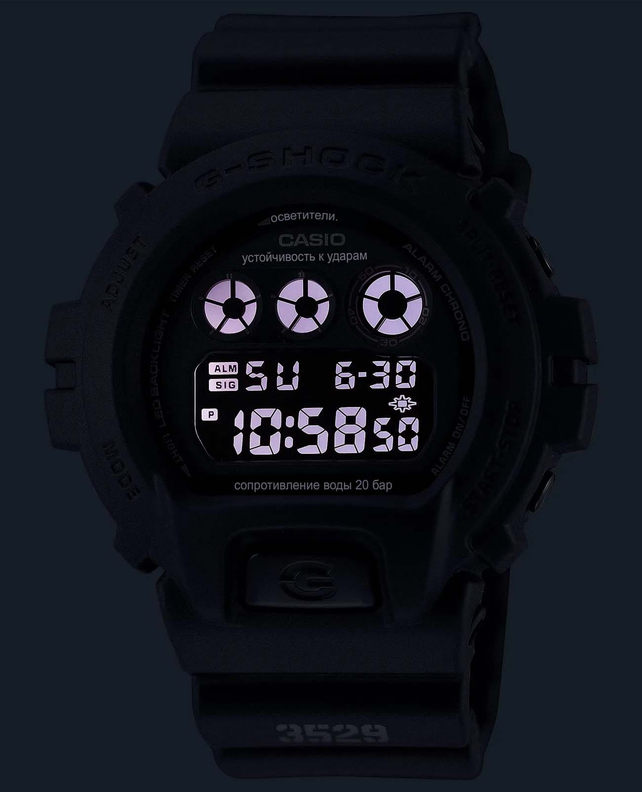 Японские мужские часы Casio G-Shock DW-6900UMS-1DR. В дизайне модели прослеживается визуальная эстетика 90-х годов, что добавляет ей особого шарма в глазах тех, кто помнит первые кассетные плееры SONY и двухкассетники SHARP. Ударопрочный корпусУдаропрочный корпусМеханизм заключён в корпус, выполненный из современных материалов, устойчивых к ударам, механическим повреждениям и падению с высоты: инновационный пластик, карбон, нержавеющая сталь, титан. из полимерного материала защищает механизм от ударов и вибрации. Минеральное стеклоМинеральное стеклоМинеральное стекло представляет собой искусственно выращенный минерал кварца. Такое стекло отличается особой устойчивостью к повреждениям и царапинам. Уступает по некоторым качествам сапфировому стеклу. устойчивое к появлению царапин, обладающее высокой прозрачностью. Светодиодная подсветкаСветодиодная подсветкаСветодиодная или LED-подсветка обеспечивает появление яркого холодного свечения за счёт LED-элементов - маленьких лампочек. Они потребляют минимальное количество энергии, чаще всего можно встретить 1 светодиод, в нижней части циферблата., послесвечение. 12/24-часовой формат. вечный календарьВечный календарьКлассическое часовое усложнение, представляющее собой календарь, рассчитанный на несколько лет вперёд (стандартно – до 2099 года). Определяет текущую дату, день недели, месяц.. СекундомерСекундомерСекундоме́р — прибор, способный измерять интервалы времени с точностью до долей секунды.. ТаймерТаймерОтсчитывает секунды в обратном направлении в заданном интервале времени.. Часовой сигнал времени. Многофункциональный будильник. Класс водозащиты: 200 метров, позволит плавать, нырять и заниматься другими водными видами спорта. Ремешок из полимерного материала на стандартной застежке.