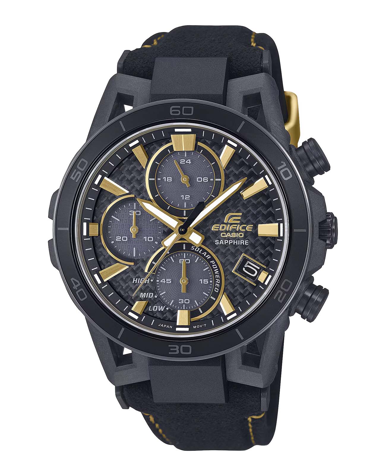 Мужские кварцевые часы Casio Edifice EFS-S640ZE-1A — это лимитированная серия, посвящённая 50-летию бренда. Модель вдохновлена подвеской болида Формулы-1 и выполнена в экстремальном дизайне, отражающем дух скорости. Корпус диаметром 44,5x50,1 мм изготовлен из алюминия, нержавеющей стали 316L и карбона с IP-покрытиемIP-покрытиеМетод ионного напыления. Демонстрирует повышенную устойчивость к истиранию, окислению и химическим веществам. Под воздействием высокого давления и температуры около 1500°C молекулы металла надёжно соединяются с частицами корпуса часов., что придаёт ему прочность, устойчивость к царапинам и привлекательный внешний вид. Ушки часов разработаны по схеме четырёхрычажной подвески гоночного автомобиля, подчёркивая спортивную направленность модели. Циферблат чёрного цвета с метками в виде штрихов выполнен из карбона и защищён сапфировым стекломСапфировое стеклоПрочный и надёжный материал из кристалла сапфира синтетического происхождения, характеризующийся особой твёрдостью и устойчивостью к царапинам и повреждениям. с антибликовым покрытиемАнтибликовое покрытиеСлой оксида металла в 0,13-0,3 микрон, благодаря которому стекло часов не бликует и не отражает свет. Антибликовое покрытие уменьшает отражение света в 10 раз, обеспечивая отличную читаемость показателей циферблата., устойчивым к повреждениям. Окошко даты расположено в положении 4 часов, а заводная головка с защитой обеспечивает надёжную фиксацию на запястье. Ремешок из алькантары шириной 22 мм оснащён классической застёжкой, обеспечивающей комфорт и надёжную фиксацию. Стальная задняя крышка крепится на 4-х винтах, что повышает водонепроницаемость до 10 бар (, что позволяет использовать модель при мытье рук или под лёгким дождём. Часы оснащены функцией хронографа с секундомером, точностью показаний 1 секунда и временем измерения 30 минут. Время отображается в 12- и 24-часовом формате. Питание осуществляется от солнечной энергии (Tough Solar), а индикатор уровня зарядки батареи позволяет контролировать состояние аккумулятора. При полной зарядке время работы без подзарядки составляет около 5 месяцев. Эти часы станут универсальным аксессуаром для тех, кто ценит сочетание стиля, функциональности и надёжности — идеальный выбор для повседневной носки и активного образа жизни.