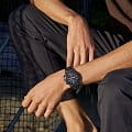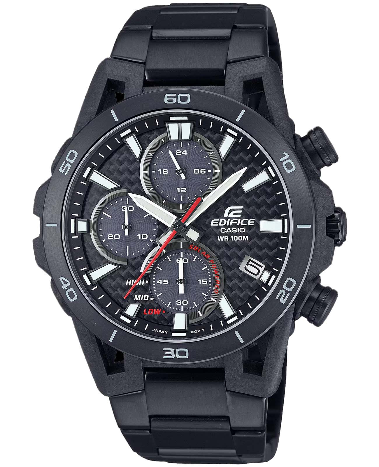 Редкая лимитированная модель — супер стильный хронограф Edifice 2024 года из серии EQS-960 в полностью черном усиленном карбоном корпусе с контрастными стрелками и метками циферблата и с яркой красной секундной стрелкой. Модуль часов надежно защищен минеральным стеклом и стальным безелем.