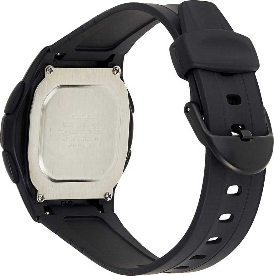 Спортивные японские мужские наручные часы Casio Collection F-200W-9A с будильникомБудильникБуди́льник — часы, в заданный момент времени подающие звуковой, световой и/или в редких случаях другой сигнал..  Корпус - Пластиковый; Стекло - Пластик; Водозащита - 50 метров, позволит защитить корпус от случайных брызг или капель дождя; Материал ремешка - Пластиковый; Цвет ремешка - Черный; Цвет циферблата - Lcd. Светодиодная подсветкаСветодиодная подсветкаСветодиодная или LED-подсветка обеспечивает появление яркого холодного свечения за счёт LED-элементов - маленьких лампочек. Они потребляют минимальное количество энергии, чаще всего можно встретить 1 светодиод, в нижней части циферблата..