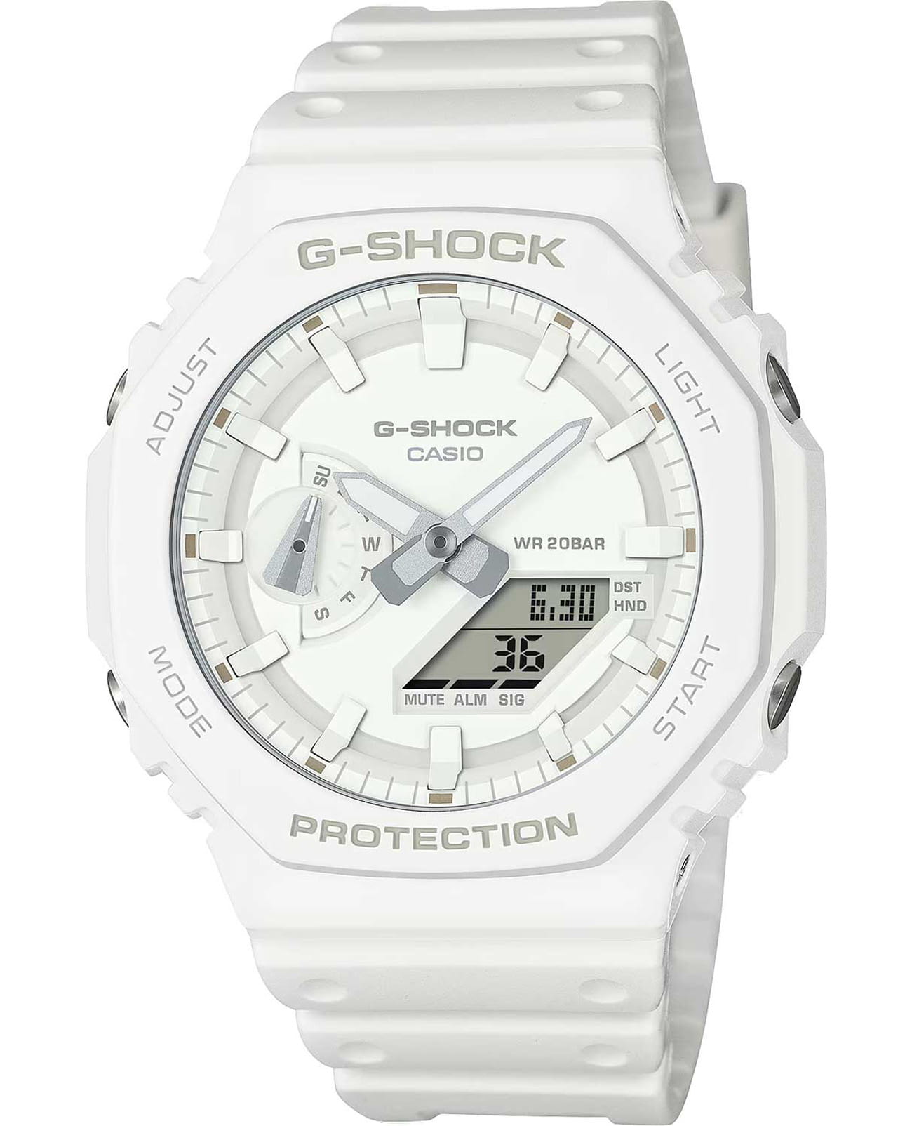 Мужские японские часы Casio G-Shock GA-2100-7A7DR (GA-2100-7A7) из противоударной коллекции G-Shock, отличаются невероятной лёгкостью и самым тонким корпусом среди всех представителей G-Shock в 11,8 мм. Оригинальный безельБезельВнешний ободок, закрепляющий стекло. В спортивных часах так называется поворотное кольцо с делениями на циферблате, выполняет роль таймера – замеряет отрезки времени на шкале. Неподвижный безель – элемент декора. Однонаправленно вращающийся безель на дайверских часах позволяет фиксировать моменты погружения и выныривания на поверхность. имеет форму октагона, часы являются современной интерпретацией модели DW-5000C. Чёрный циферблат дополнен контрастными серыми стрелками и часовыми индексами. Ударопрочный корпусУдаропрочный корпусМеханизм заключён в корпус, выполненный из современных материалов, устойчивых к ударам, механическим повреждениям и падению с высоты: инновационный пластик, карбон, нержавеющая сталь, титан. характеризуется повышенной устойчивостью к ударам и повреждениям за счёт технологии Carbon Core GuardCarbon Core Guard Новейшая структура корпуса, разработанная Casio. Полиуретановая пластина дополнительно усилена карбоновыми вставками, что придаёт специальную защиту от механических повреждений. Карбон отличается лёгкостью и прочностью.. Ремешок из полимерного материала с обновлённым креплением. Функция складывания стрелок для чтения показателей с дисплеев. Мировое времяМировое время Полезное часовое усложнение, отображающее время в основных городах и известных областях по всему миру, оно связано с часовыми поясами, удобно для путешественников и бизнесменов. , секундомер, 5 будильников, автоматический календарь. Срок службы батарейки – 3 года. Габариты: 48,5 x 45,4 x 11,8 мм.