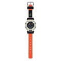 Аксессуар стал отражением уличной моды, стильный безельБезельВнешний ободок, закрепляющий стекло. В спортивных часах так называется поворотное кольцо с делениями на циферблате, выполняет роль таймера – замеряет отрезки времени на шкале. Неподвижный безель – элемент декора. Однонаправленно вращающийся безель на дайверских часах позволяет фиксировать моменты погружения и выныривания на поверхность. выполнен в форме гайки. Противоударный корпусУдаропрочный корпусМеханизм заключён в корпус, выполненный из современных материалов, устойчивых к ударам, механическим повреждениям и падению с высоты: инновационный пластик, карбон, нержавеющая сталь, титан. из пластика защищает японский кварцевый механизм от ударов, повреждений и вибрации. Текстильный ремешок с оранжевыми деталями с кожаной подложкой. Герметичность конструкции сохраняется при давлении до 20 бар. Срок службы батареи - 7 лет. Функции: будильник, светодиоднаяСветодиодная подсветкаСветодиодная или LED-подсветка обеспечивает появление яркого холодного свечения за счёт LED-элементов - маленьких лампочек. Они потребляют минимальное количество энергии, чаще всего можно встретить 1 светодиод, в нижней части циферблата. и люминесцентная подсветкаЛюминесцентное покрытиеПозволяет считывать показания времени в темноте. Производители наносят на стрелки, часовые индексы, безель или поверхность циферблата светонакопительный состав, дающий холодное свечение., календарь, мировое времяМировое время Полезное часовое усложнение, отображающее время в основных городах и известных областях по всему миру, оно связано с часовыми поясами, удобно для путешественников и бизнесменов. , хронографХронографФункция позволяет измерять отрезки времени с особой точностью: часы, минуты, секунды. Верным признаком хронографа является наличие на циферблате 3 дополнительных окошек-счётчиков..