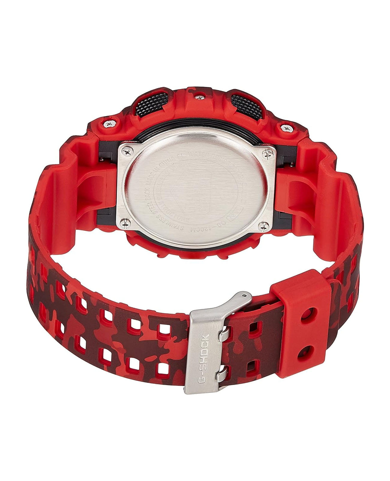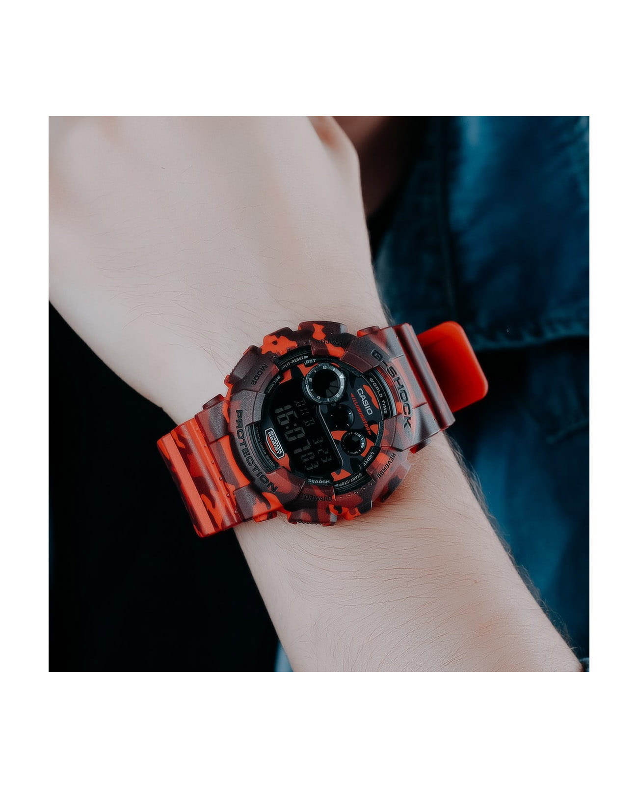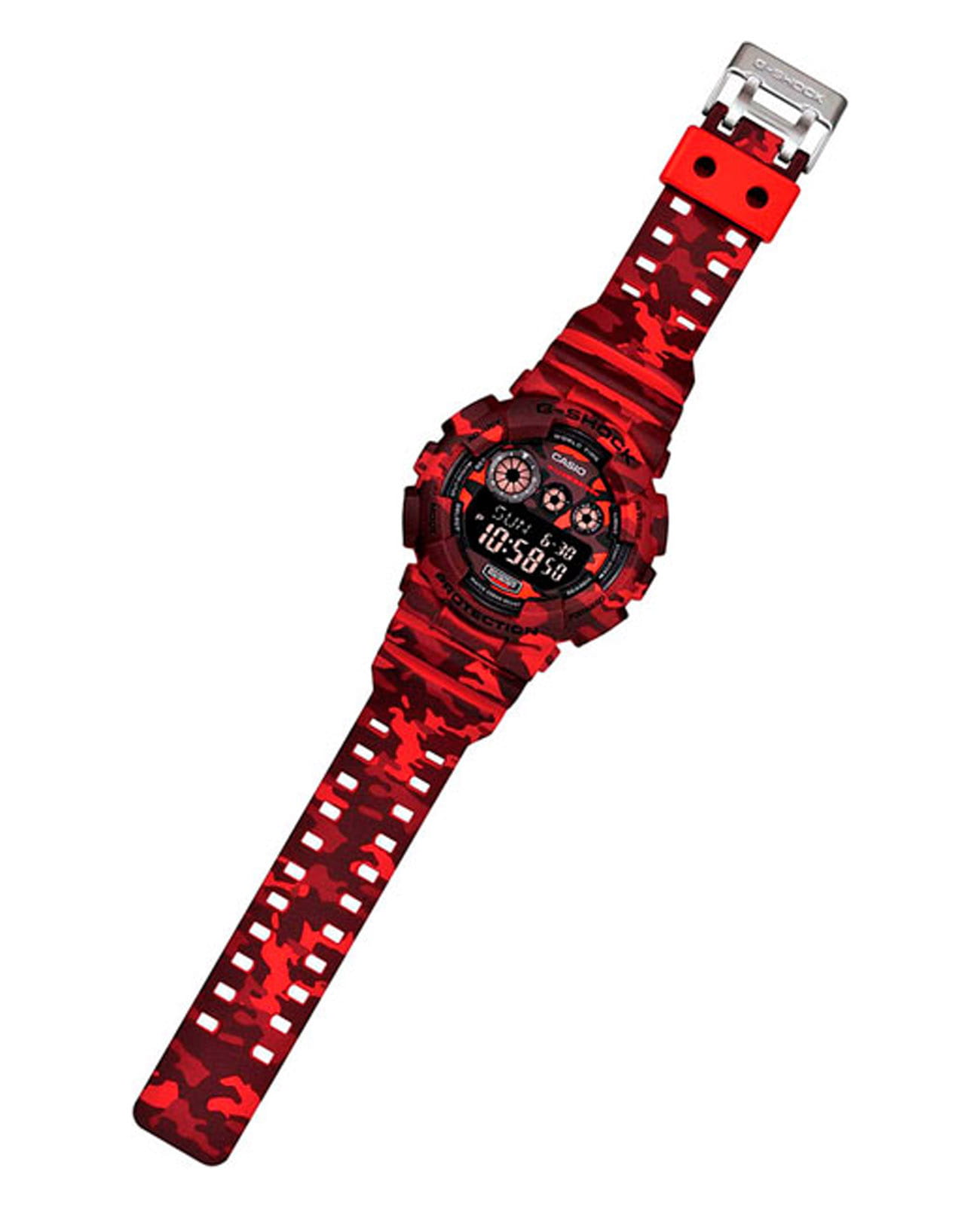 Японские мужские часы-хронографХронографФункция позволяет измерять отрезки времени с особой точностью: часы, минуты, секунды. Верным признаком хронографа является наличие на циферблате 3 дополнительных окошек-счётчиков. Casio G-Shock GD-120CM-4DR из коллекции G-Shock. Противоударный пластиковый корпус с карбоновыми волокнами более прочный и, в то же время, более легкий.  Минеральное стеклоМинеральное стеклоМинеральное стекло представляет собой искусственно выращенный минерал кварца. Такое стекло отличается особой устойчивостью к повреждениям и царапинам. Уступает по некоторым качествам сапфировому стеклу. устойчивое к появлению царапин, обладающее высокой прозрачностью. Ударопрочный корпусУдаропрочный корпусМеханизм заключён в корпус, выполненный из современных материалов, устойчивых к ударам, механическим повреждениям и падению с высоты: инновационный пластик, карбон, нержавеющая сталь, титан. защищает механизм от ударов и вибрации. Светодиодная подсветкаСветодиодная подсветкаСветодиодная или LED-подсветка обеспечивает появление яркого холодного свечения за счёт LED-элементов - маленьких лампочек. Они потребляют минимальное количество энергии, чаще всего можно встретить 1 светодиод, в нижней части циферблата. освещает весь циферблат. Мировое времяМировое время Полезное часовое усложнение, отображающее время в основных городах и известных областях по всему миру, оно связано с часовыми поясами, удобно для путешественников и бизнесменов. – 48 городов (29 часовых поясов). СекундомерСекундомерСекундоме́р — прибор, способный измерять интервалы времени с точностью до долей секунды. с точностью измерения 1/100 секунды и измерением до 23 часов 59 минут 59,99 cек. ТаймерТаймерОтсчитывает секунды в обратном направлении в заданном интервале времени. обратного отсчета (диапазон времени 24 часа), автоматический календарь, 12/24 отображение времени. 5будильниковБудильникБуди́льник — часы, в заданный момент времени подающие звуковой, световой и/или в редких случаях другой сигнал., один с функцией Snooze, ежечасный сигнал.  Класс водозащиты: 200 метров, позволит плавать, нырять и заниматься другими водными видами спорта. Ремешок из полимерного материала на стандартной застежке.