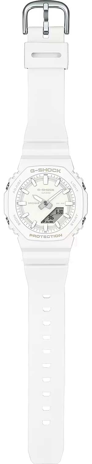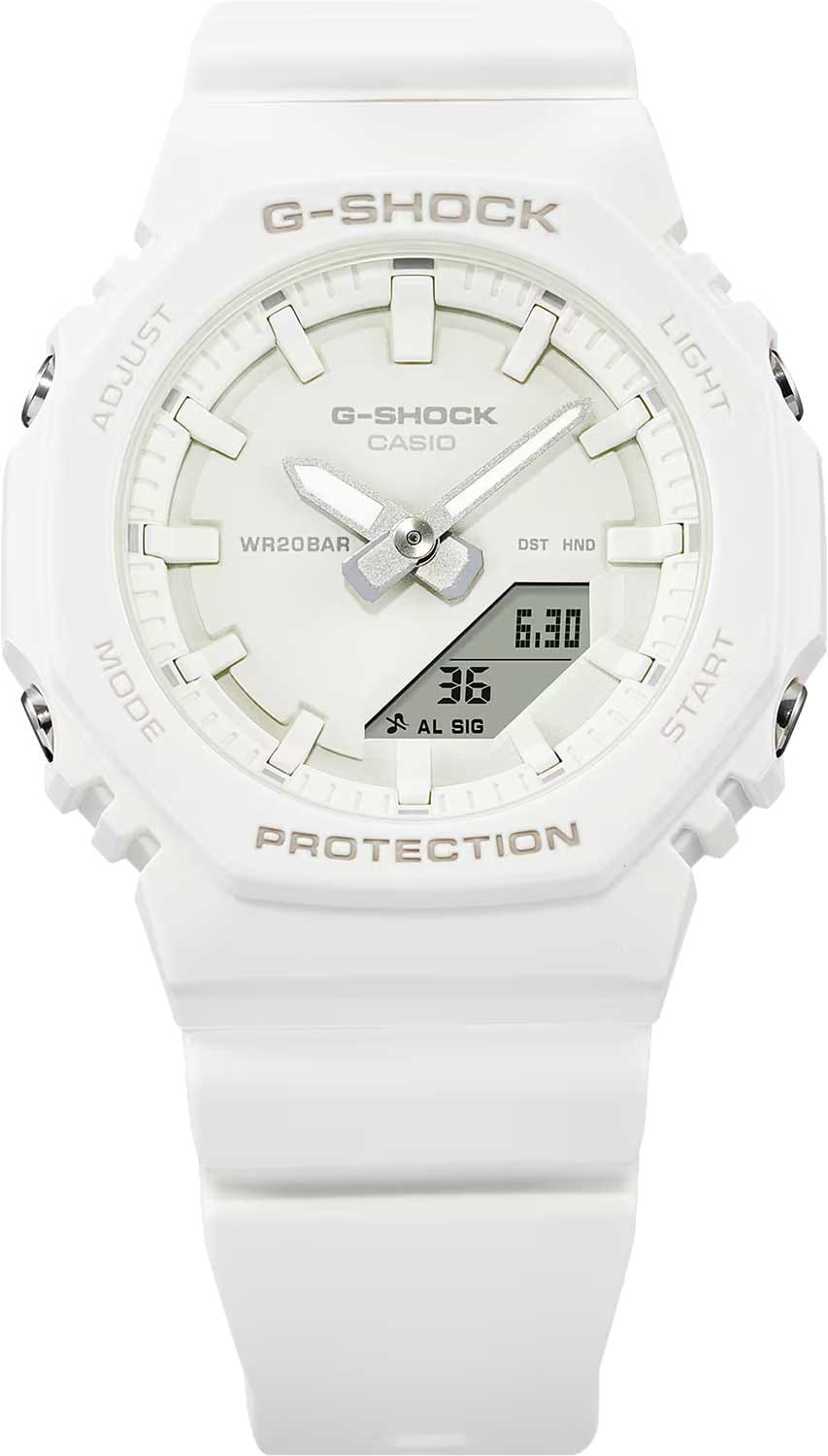 Женские кварцевые часы Casio G-Shock Casio G-Shock GMA-P2100-7A. Корпус часов изготовлен из пластика. Стрелки с люминесцентным покрытиемЛюминесцентное покрытиеПозволяет считывать показания времени в темноте. Производители наносят на стрелки, часовые индексы, безель или поверхность циферблата светонакопительный состав, дающий холодное свечение.. Водозащита: 200 метров, позволит плавать, нырять и заниматься другими водными видами спорта. Минеральное стеклоМинеральное стеклоМинеральное стекло представляет собой искусственно выращенный минерал кварца. Такое стекло отличается особой устойчивостью к повреждениям и царапинам. Уступает по некоторым качествам сапфировому стеклу. устойчивое к появлению царапин, обладающее высокой прозрачностью. Необритовое светонакопительное покрытие обеспечивает длительное послесвечение в темноте даже после кратковременного нахождения на свету. 12-ти и 24-х часовой формат времени. Секундомер с двумя точностями показаний: 1/100с (до 1ч) и 1с (после 1ч) и временем измерения 24ч. SPLIT-хронограф. Таймер обратного отсчета от 1с до 24ч. Мировое время – 48 городов (31 часовой пояс), всемирное координированное время (UTC). Пластиковый ремешок с классической застежкой.