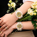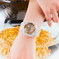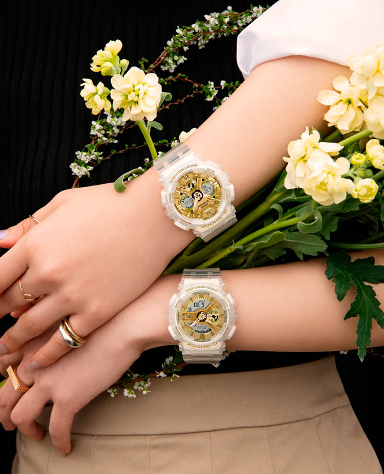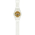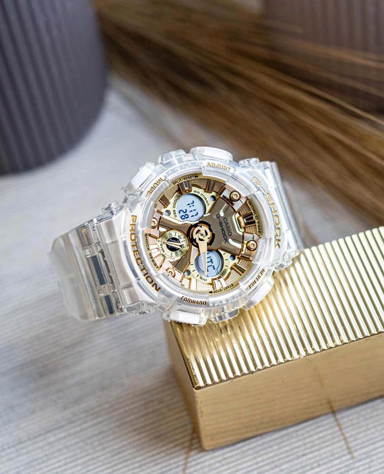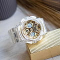 Японские женские часы-хронографХронографФункция позволяет измерять отрезки времени с особой точностью: часы, минуты, секунды. Верным признаком хронографа является наличие на циферблате 3 дополнительных окошек-счётчиков. Casio G-Shock GMA-S120SG-7AER. Стильная и лаконичная фешн-модель в полупрозрачном корпусе из серии G-SHOCK S SERIES с аналого-цифровым циферблатом золотого цвета. Без сомнения, эти яркие и аутентичные джишоки способны приковать к себе внимание и украсить любое, даже самое изящное женское запястье. Минеральное стеклоМинеральное стеклоМинеральное стекло представляет собой искусственно выращенный минерал кварца. Такое стекло отличается особой устойчивостью к повреждениям и царапинам. Уступает по некоторым качествам сапфировому стеклу. устойчивое к появлению царапин, обладающее высокой прозрачностью. Ударопрочный корпусУдаропрочный корпусМеханизм заключён в корпус, выполненный из современных материалов, устойчивых к ударам, механическим повреждениям и падению с высоты: инновационный пластик, карбон, нержавеющая сталь, титан. защищает механизм от ударов и вибрации. Многокомпонентный циферблат состоит из цифровых окошек указателей числа и дня недели, а также индикатора режима работы часов, который расположен в позиции 9 часов и выполнен в виде пропеллера. Светодиодная автоподсветка - при повороте часов в сторону лица подсветка дисплея осуществляется автоматически. Настраиваемое послесвечение 1,5 или 3сек. Мировое времяМировое время Полезное часовое усложнение, отображающее время в основных городах и известных областях по всему миру, оно связано с часовыми поясами, удобно для путешественников и бизнесменов. – 48 городов (29 часовых поясов). СекундомерСекундомерСекундоме́р — прибор, способный измерять интервалы времени с точностью до долей секунды. с точностью измерения 1/100 секунды и измерением до 23 часов 59 минут 59,99 cек. ТаймерТаймерОтсчитывает секунды в обратном направлении в заданном интервале времени. обратного отсчета (диапазон времени 24 часа), автоматический календарь, 12/24 отображение времени. 5 будильниковБудильникБуди́льник — часы, в заданный момент времени подающие звуковой, световой и/или в редких случаях другой сигнал., один с функцией Snooze, ежечасный сигнал. Класс водозащиты: 200 метров, позволит плавать, нырять и заниматься другими водными видами спорта. Ремешок из полимерного материала на стандартной застежке.