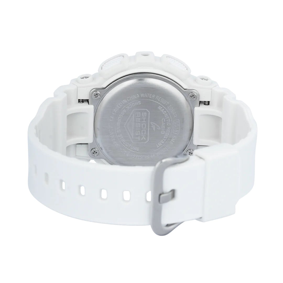 Японские женские часы GMA-S120VA-7A из коллекции G-Shock представлены в спортивном облачении. Кварцевые часы. Аналогово-цифровой циферблат. Наручные часы с противоударным корпусомУдаропрочный корпусМеханизм заключён в корпус, выполненный из современных материалов, устойчивых к ударам, механическим повреждениям и падению с высоты: инновационный пластик, карбон, нержавеющая сталь, титан. выполнены из полимерного материала, легко поглощающего силу удара и вибрации, что делает их надёжным и долговечным аксессуаром. Кварцевый механизм японского производства. Батарейка рассчитана на 3 года службы. Стрелки со светодиодной подсветкойСветодиодная подсветкаСветодиодная или LED-подсветка обеспечивает появление яркого холодного свечения за счёт LED-элементов - маленьких лампочек. Они потребляют минимальное количество энергии, чаще всего можно встретить 1 светодиод, в нижней части циферблата.. Минеральное стеклоМинеральное стеклоМинеральное стекло представляет собой искусственно выращенный минерал кварца. Такое стекло отличается особой устойчивостью к повреждениям и царапинам. Уступает по некоторым качествам сапфировому стеклу.. Защита от магнитных полей. Водонепроницаемость 200 метров, позволит плавать, нырять и заниматься другими водными видами спорта. Функциональные возможности: мировое времяМировое время Полезное часовое усложнение, отображающее время в основных городах и известных областях по всему миру, оно связано с часовыми поясами, удобно для путешественников и бизнесменов. , таймерТаймерОтсчитывает секунды в обратном направлении в заданном интервале времени. обратного отсчёта, будильникБудильникБуди́льник — часы, в заданный момент времени подающие звуковой, световой и/или в редких случаях другой сигнал., хронографХронографФункция позволяет измерять отрезки времени с особой точностью: часы, минуты, секунды. Верным признаком хронографа является наличие на циферблате 3 дополнительных окошек-счётчиков., автоматический календарь до 2099 года, UTCUTCВсемирное кординационное время, не имеющее привязки к географическому положению Гринвича, основывается на атомном отсчёте времени. Регулировка времени осуществляется более точно, чем устаревшее GMT.