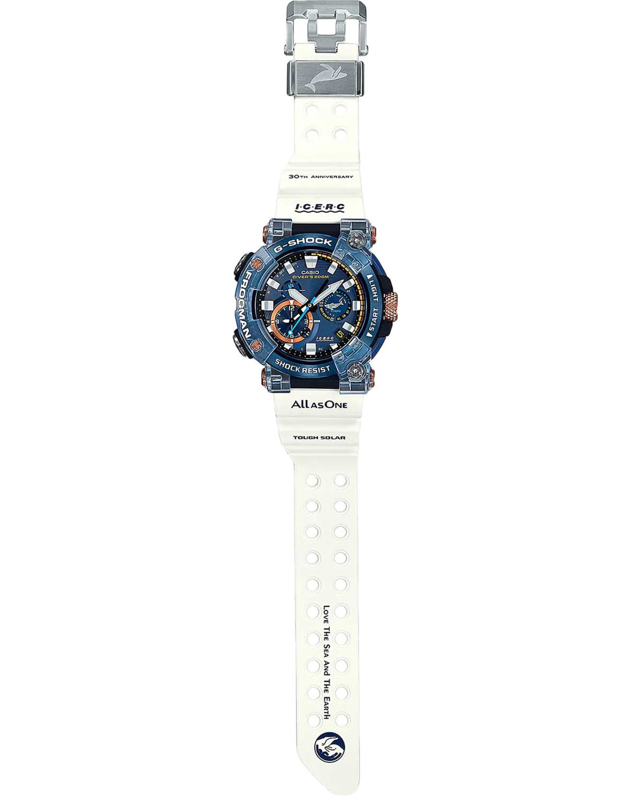 Новика часов Frogman создана не только для профессиональных дайверов, но и для простых любителей морских глубин. G-Shock Frogman. Модель создана в честь 30-летия ICERC Japan (Международного центра исследований образования китообразных). На задней крышке выгравирован девиз «Love The Sea And The Earth» (Любите Море и Землю.) Питание от солнечной энергии Tough Solar - солнечные батарейки большой мощности, индикатор заряда батареи. Функция автоматического сохранения энергии. Время работы аккумулятора без подзарядки до 5 месяцев, при включенной функции сохранения энергии до 30 месяцев. Противоударный корпус защищает механизм от ударов и вибрации. Ударопрочная конструкция Carbon Core Guard объединяет корпус и заднюю крышку в единый карбоновый моноблок. Защищены от магнитных полей. Циферблат подсвечивается ярким светодиодом. Послесвечение. Цвет подсветки: белый. Необритовое светонакопительное покрытие обеспечивает длительное послесвечение в темноте даже после кратковременного нахождения на свету.