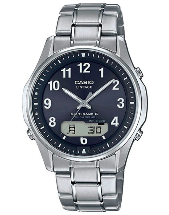 Высокотехнологичные японские наручные мужские часы. Круглый корпус и браслет часов выполнены из титана. Водонепроницаемость 50 ATM.  Круглый циферблат черного цвета. Часы оснащены такими функциями как секундомер, таймер обратного отсчета, будильник, мировое время, второй часовой пояс, прием радиосигнала. Сапфировое стекло не царапается.