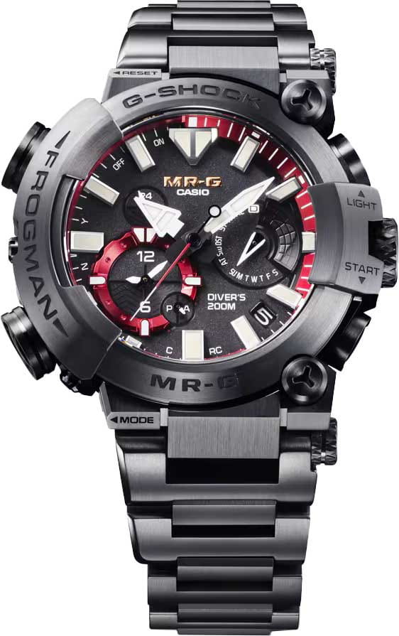 Японские мужские часы-хронографХронографФункция позволяет измерять отрезки времени с особой точностью: часы, минуты, секунды. Верным признаком хронографа является наличие на циферблате 3 дополнительных окошек-счётчиков. Casio G-Shock MRG-BF1000B-1A . Ударопрочный корпусУдаропрочный корпусМеханизм заключён в корпус, выполненный из современных материалов, устойчивых к ударам, механическим повреждениям и падению с высоты: инновационный пластик, карбон, нержавеющая сталь, титан. защищает механизм от ударов и вибрации.Сапфировое стеклоСапфировое стеклоПрочный и надёжный материал из кристалла сапфира синтетического происхождения, характеризующийся особой твёрдостью и устойчивостью к царапинам и повреждениям. устойчивое к появлению царапин, обладающее высокой прозрачностью. Светодиодная подсветкаСветодиодная подсветкаСветодиодная или LED-подсветка обеспечивает появление яркого холодного свечения за счёт LED-элементов - маленьких лампочек. Они потребляют минимальное количество энергии, чаще всего можно встретить 1 светодиод, в нижней части циферблата. (Super Illuminator), послесвечение. Двойное время, 27 часовых поясов, смена времени в домашнем городе, автоматическое переключение летнего времени (DST). 12/24-часовой формат. Вечный календарьВечный календарьКлассическое часовое усложнение, представляющее собой календарь, рассчитанный на несколько лет вперёд (стандартно – до 2099 года). Определяет текущую дату, день недели, месяц.. СекундомерСекундомерСекундоме́р — прибор, способный измерять интервалы времени с точностью до долей секунды.. ТаймерТаймерОтсчитывает секунды в обратном направлении в заданном интервале времени.. Ежедневный будильник. Автоматическая коррекция исходного положения стрелки. Класс водозащиты: 200 метров, позволит плавать, нырять и заниматься другими водными видами спорта. Титановый браслет с DLC-покрытиемDLC-покрытиеDiamond like carbon - одно из лучших видов покрытия, представляющее собой углерод с алмазными свойствами. На поверхность материала наносятся распавшиеся молекулы углерода, превращающиеся в плёнку из алмазоподобных связей, которая перенимает твёрдость алмаза. на раскладной застёжкеРаскладная застёжкаТакой тип застёжки используется только на браслетах из металла. Она никогда не раскрывается полностью, происходит разделение на 2 и более частей. Раскладывающая застёжка снизит вероятность потери часов к минимуму..