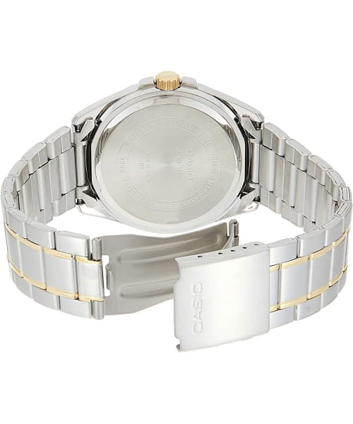 Японские мужские часы с минеральным стекломМинеральное стеклоМинеральное стекло представляет собой искусственно выращенный минерал кварца. Такое стекло отличается особой устойчивостью к повреждениям и царапинам. Уступает по некоторым качествам сапфировому стеклу. Casio Collection MTP-1308SG-7A, кварцевый механизм с высокой точностью. Класс водозащиты: 50 метров, позволит защитить корпус от случайных брызг или капель дождя. Корпус часов изготовлен из стали. Стальной браслет с частичным IP-покрытиемIP-покрытиеМетод ионного напыления. Демонстрирует повышенную устойчивость к истиранию, окислению и химическим веществам. Под воздействием высокого давления и температуры около 1500°C молекулы металла надёжно соединяются с частицами корпуса часов. на раскладной застёжкеРаскладная застёжкаТакой тип застёжки используется только на браслетах из металла. Она никогда не раскрывается полностью, происходит разделение на 2 и более частей. Раскладывающая застёжка снизит вероятность потери часов к минимуму.. Стрелки с люминесцентным покрытиемЛюминесцентное покрытиеПозволяет считывать показания времени в темноте. Производители наносят на стрелки, часовые индексы, безель или поверхность циферблата светонакопительный состав, дающий холодное свечение.. Окошко даты находится в положении 3 часа. Заводная головка с защитой.