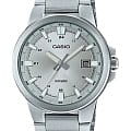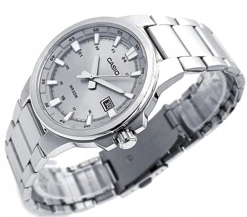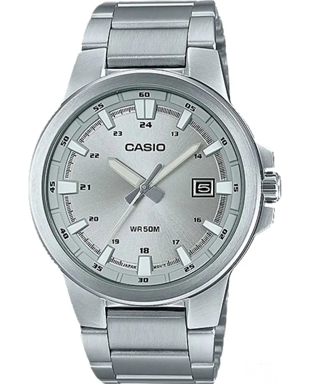 Японские мужские наручные часы с минеральным стекломМинеральное стеклоМинеральное стекло представляет собой искусственно выращенный минерал кварца. Такое стекло отличается особой устойчивостью к повреждениям и царапинам. Уступает по некоторым качествам сапфировому стеклу. Casio Collection MTP-E173D-7A, кварцевый механизм с высокой точностью. Окошко даты с увеличительным стеклом. Класс водозащиты: 50 метров, позволит защитить корпус от случайных брызг или капель дождя. Корпус часов изготовлен из стали. Стальной браслет на раскладной застёжкеРаскладная застёжкаТакой тип застёжки используется только на браслетах из металла. Она никогда не раскрывается полностью, происходит разделение на 2 и более частей. Раскладывающая застёжка снизит вероятность потери часов к минимуму.. Стрелки и метки с люминесцентным покрытиемЛюминесцентное покрытиеПозволяет считывать показания времени в темноте. Производители наносят на стрелки, часовые индексы, безель или поверхность циферблата светонакопительный состав, дающий холодное свечение..