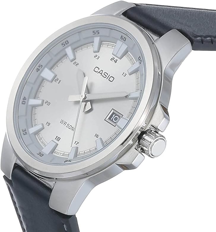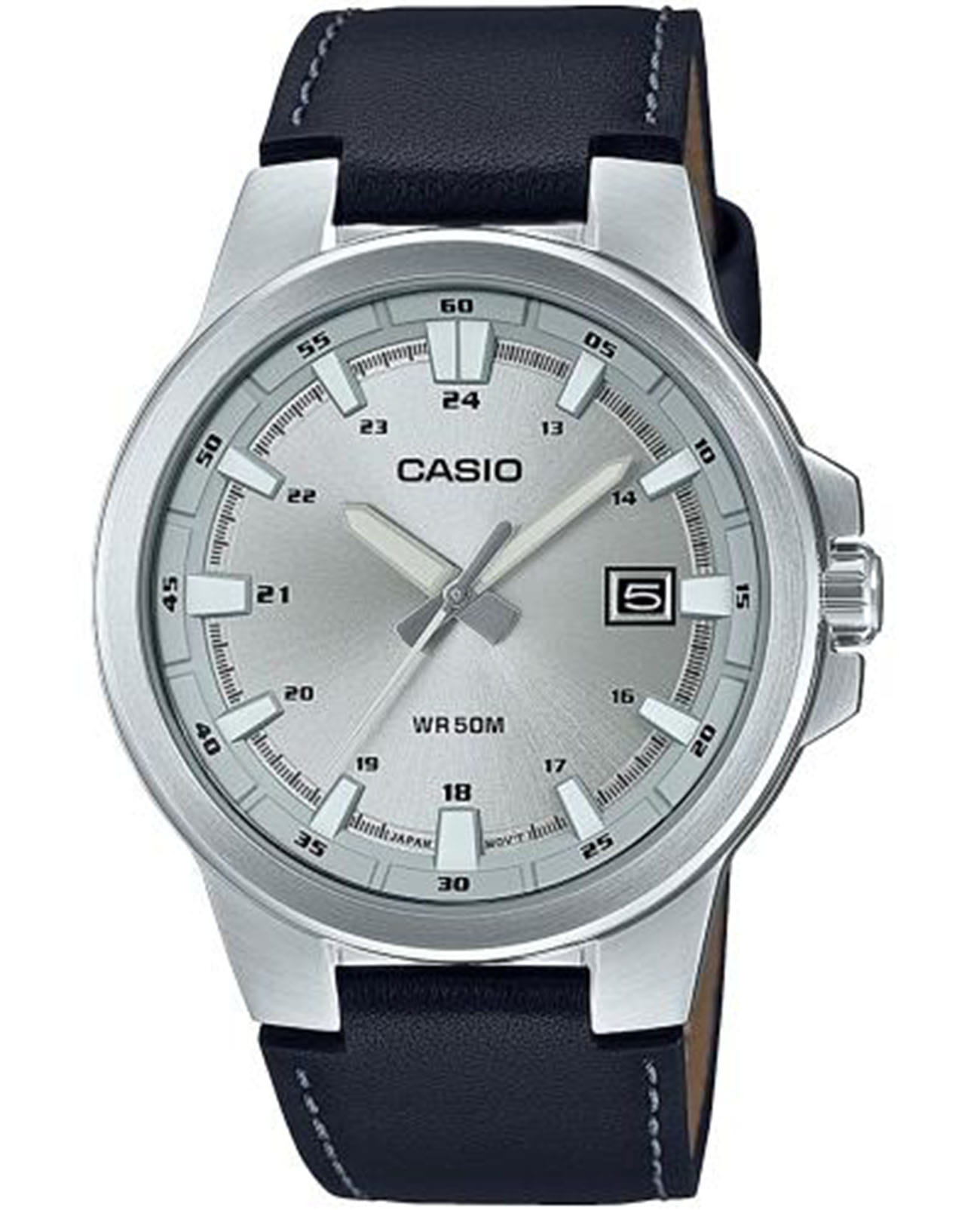Японские мужские наручные часы с минеральным стекломМинеральное стеклоМинеральное стекло представляет собой искусственно выращенный минерал кварца. Такое стекло отличается особой устойчивостью к повреждениям и царапинам. Уступает по некоторым качествам сапфировому стеклу. Casio Collection MTP-E173L-7AVEF кварцевый механизм с высокой точностью. Окошко даты с увеличительным стеклом. Класс водозащиты: 50 метров, позволит защитить корпус от случайных брызг или капель дождя. Корпус часов изготовлен из нержавеющей стали. Стрелки и метки с люминесцентным покрытиемЛюминесцентное покрытиеПозволяет считывать показания времени в темноте. Производители наносят на стрелки, часовые индексы, безель или поверхность циферблата светонакопительный состав, дающий холодное свечение..
