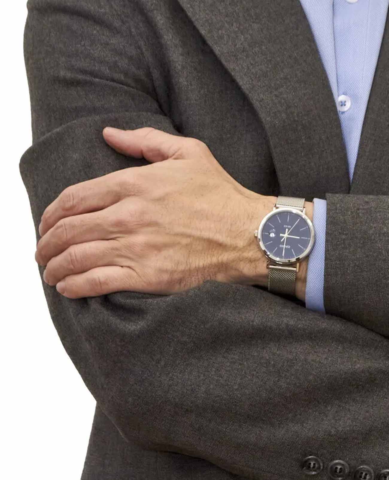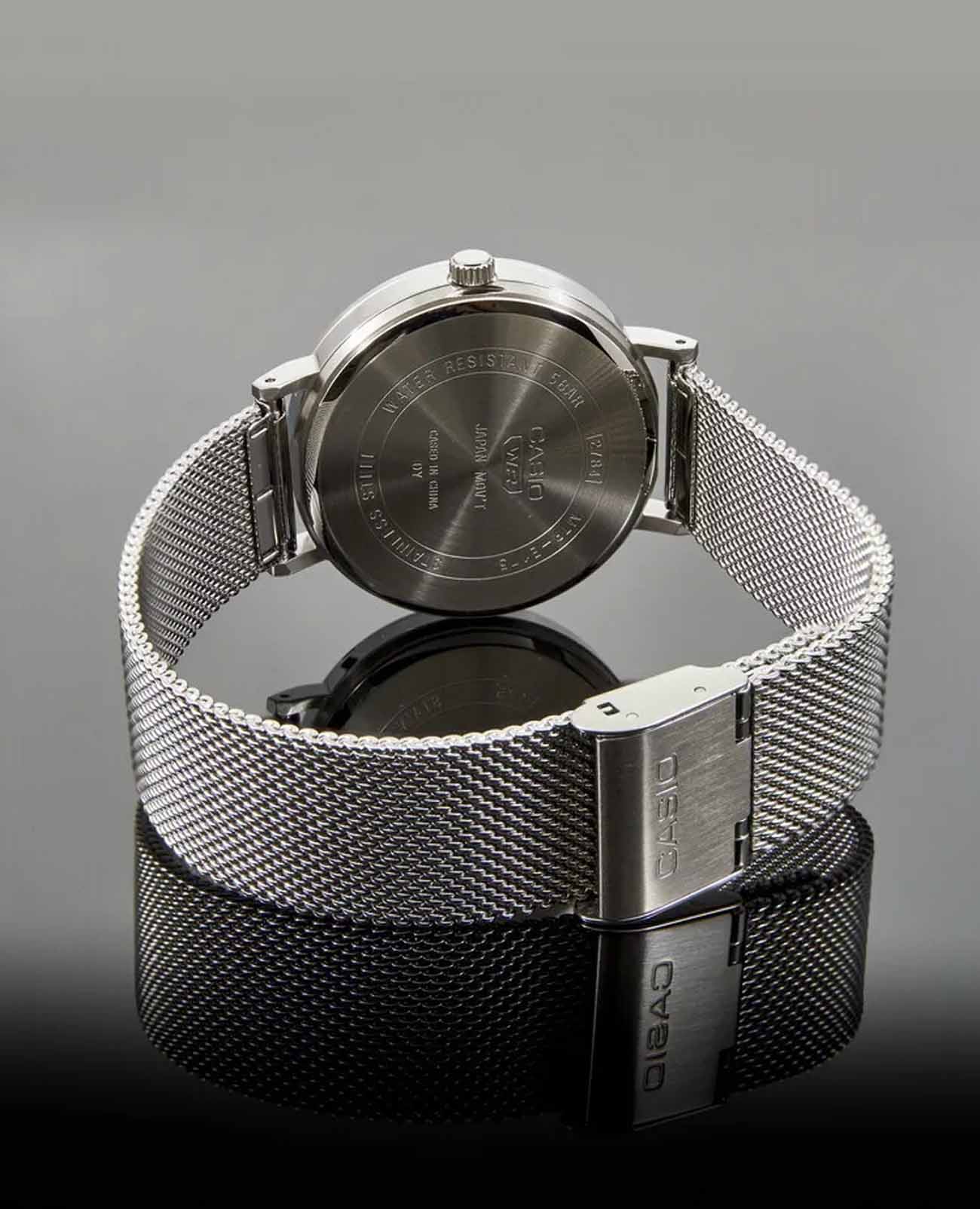 Японские мужские часы с минеральным стекломМинеральное стеклоМинеральное стекло представляет собой искусственно выращенный минерал кварца. Такое стекло отличается особой устойчивостью к повреждениям и царапинам. Уступает по некоторым качествам сапфировому стеклу. Casio Collection MTP-E175MB-2E, кварцевый механизм с высокой точностью. Корпус часов изготовлен из стали.  Циферблат с метками в виде штрихов. Окошко даты находится в положении 3 часа. Рифленая заводная головка. Класс водозащиты: 50 метров, позволит защитить корпус от случайных брызг или капель дождя. Стальной браслет миланского плетения на раскладном замкеРаскладной замокДанный вариант застежки используется только на часах с металлическим браслетом. Отличительная особенность такого крепления в том, что длина браслета становится универсальной и вы можете самостоятельно отрегулировать нужный вам размер – застежка просто двигается по браслету часов..