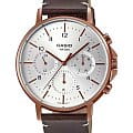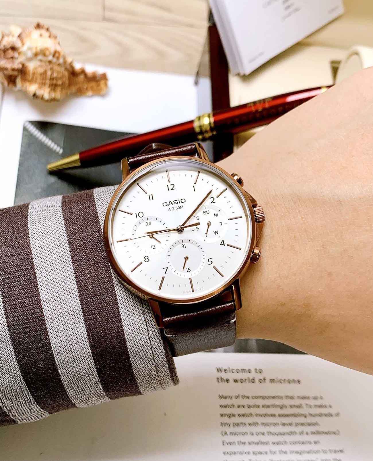 Японские мужские часы с минеральным стекломМинеральное стеклоМинеральное стекло представляет собой искусственно выращенный минерал кварца. Такое стекло отличается особой устойчивостью к повреждениям и царапинам. Уступает по некоторым качествам сапфировому стеклу. Casio Collection MTP-E321RL-5A, кварцевый механизм с высокой точностью. Корпус часов изготовлен из стали с IP-покрытиемIP-покрытиеМетод ионного напыления. Демонстрирует повышенную устойчивость к истиранию, окислению и химическим веществам. Под воздействием высокого давления и температуры около 1500°C молекулы металла надёжно соединяются с частицами корпуса часов.. Циферблат выполнен по технологии Sunray (солнечные лучи). 12-ти и 24-х часовой формат времени, число и день недели вынесены на отдельные циферблаты. Метки в виде штрихов и арабских цифр. Заводная головка с защитой. Батарейка рассчитана на 3 года. Класс водозащиты: 50 метров, позволит защитить корпус от случайных брызг или капель дождя. Кожаный ремешок на стандартной застёжке.