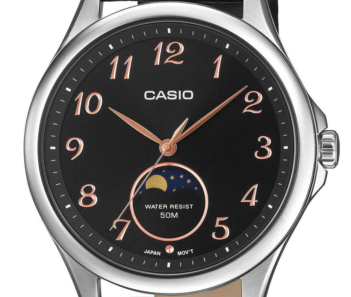 Японские мужские часы с минеральным стекломМинеральное стеклоМинеральное стекло представляет собой искусственно выращенный минерал кварца. Такое стекло отличается особой устойчивостью к повреждениям и царапинам. Уступает по некоторым качествам сапфировому стеклу. Casio Collection MTP-M110L-1A, кварцевый механизм с высокой точностью. Изысканный корпус часов изготовлен из стали серебристого цвета, что обеспечивает долговечность и утончённый внешний вид. Циферблат с метками в виде арабских цифр с отображением фаз Луны в положении 6 часов. Заводная головка с защитой. Батарейка рассчитана на 3 года. Класс водозащиты: 50 метров, позволит защитить корпус от случайных брызг или капель дождя. Изысканный кожаный ремешок на стандартной застёжке гармонично дополняет корпус и обеспечивает комфортное ношение. Эти часы подойдут для повседневного ношения и станут ярким акцентом в вашем наряде.