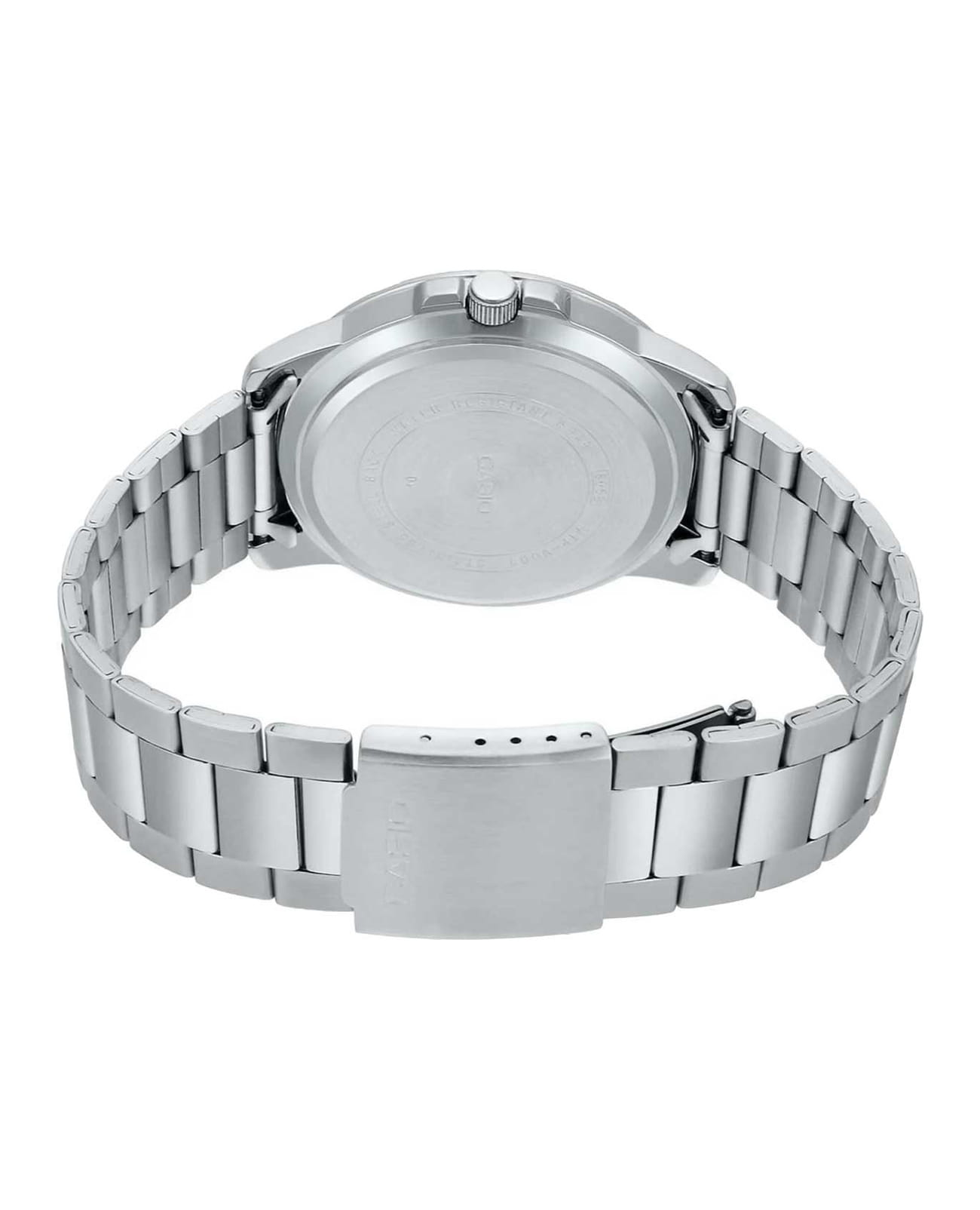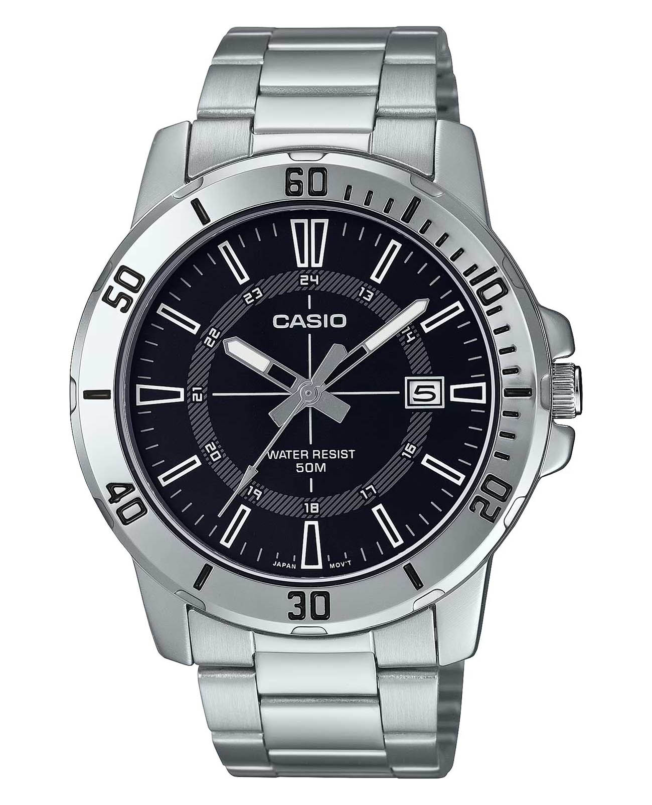 Японские мужские кварцевые часы с минеральным стекломМинеральное стеклоМинеральное стекло представляет собой искусственно выращенный минерал кварца. Такое стекло отличается особой устойчивостью к повреждениям и царапинам. Уступает по некоторым качествам сапфировому стеклу. Casio Collection MTP-VD01D-1CV, кварцевый механизм с высокой точностью. Корпус и браслет часов изготовлен из нержавеющей стали. 12-ти и 24-х часовой формат времени. Циферблат с метками в виде штрихов. Окошко даты находится в положении 3 часа. Заводная головка с защитой. Батарея рассчитана на 3 года. Класс водозащиты: 50 метров, позволит защитить корпус от случайных брызг или капель дождя. Стальной браслет на раскладной застёжкеРаскладная застёжкаТакой тип застёжки используется только на браслетах из металла. Она никогда не раскрывается полностью, происходит разделение на 2 и более частей. Раскладывающая застёжка снизит вероятность потери часов к минимуму..