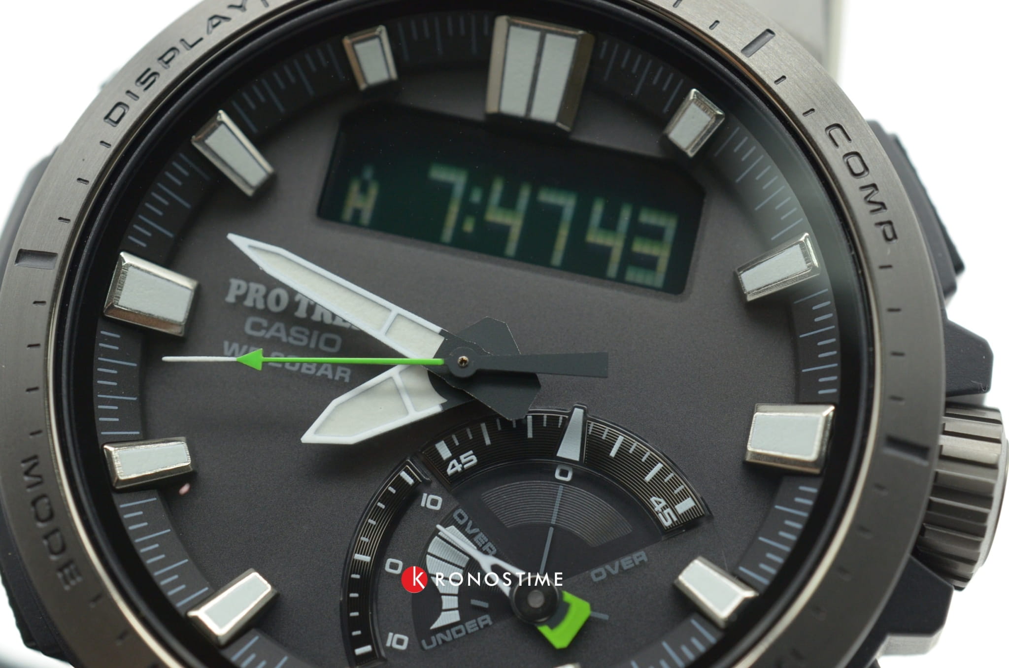Модель с зелёными деталями отражает спортивный стиль и выигрышно смотрится на запястье. Ударопрочный корпусУдаропрочный корпусМеханизм заключён в корпус, выполненный из современных материалов, устойчивых к ударам, механическим повреждениям и падению с высоты: инновационный пластик, карбон, нержавеющая сталь, титан. выполнен из пластика и стали 316L с IP-покрытиемIP-покрытиеМетод ионного напыления. Демонстрирует повышенную устойчивость к истиранию, окислению и химическим веществам. Под воздействием высокого давления и температуры около 1500°C молекулы металла надёжно соединяются с частицами корпуса часов., что делает его устойчивым к различным видам повреждений. Наручные часы с японским кварцевым механизмом работают от солнечной батареи , функция сохранения энергии увеличивает срок работы часов без подзарядки до 21 месяца. Сапфировое стекло с покрытием «антиблик». Двойная светодиодная подсветкаСветодиодная подсветкаСветодиодная или LED-подсветка обеспечивает появление яркого холодного свечения за счёт LED-элементов - маленьких лампочек. Они потребляют минимальное количество энергии, чаще всего можно встретить 1 светодиод, в нижней части циферблата.. Водостойкость 20 бар. Устойчивость к температуре ниже -10°C. Коррекция времени радиосигналом, барометр, лунный календарь, высотомер, таймер, график восхода и заката солнца, датчик приливов и отливов, мировое времяМировое время Полезное часовое усложнение, отображающее время в основных городах и известных областях по всему миру, оно связано с часовыми поясами, удобно для путешественников и бизнесменов. – 31 часовой пояс, календарь, хронографХронографФункция позволяет измерять отрезки времени с особой точностью: часы, минуты, секунды. Верным признаком хронографа является наличие на циферблате 3 дополнительных окошек-счётчиков.. Таймер рыбалки подсказывает, какое время оптимально подходит для ловли рыбы. Габариты: 51 x 50 x 15 мм.