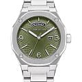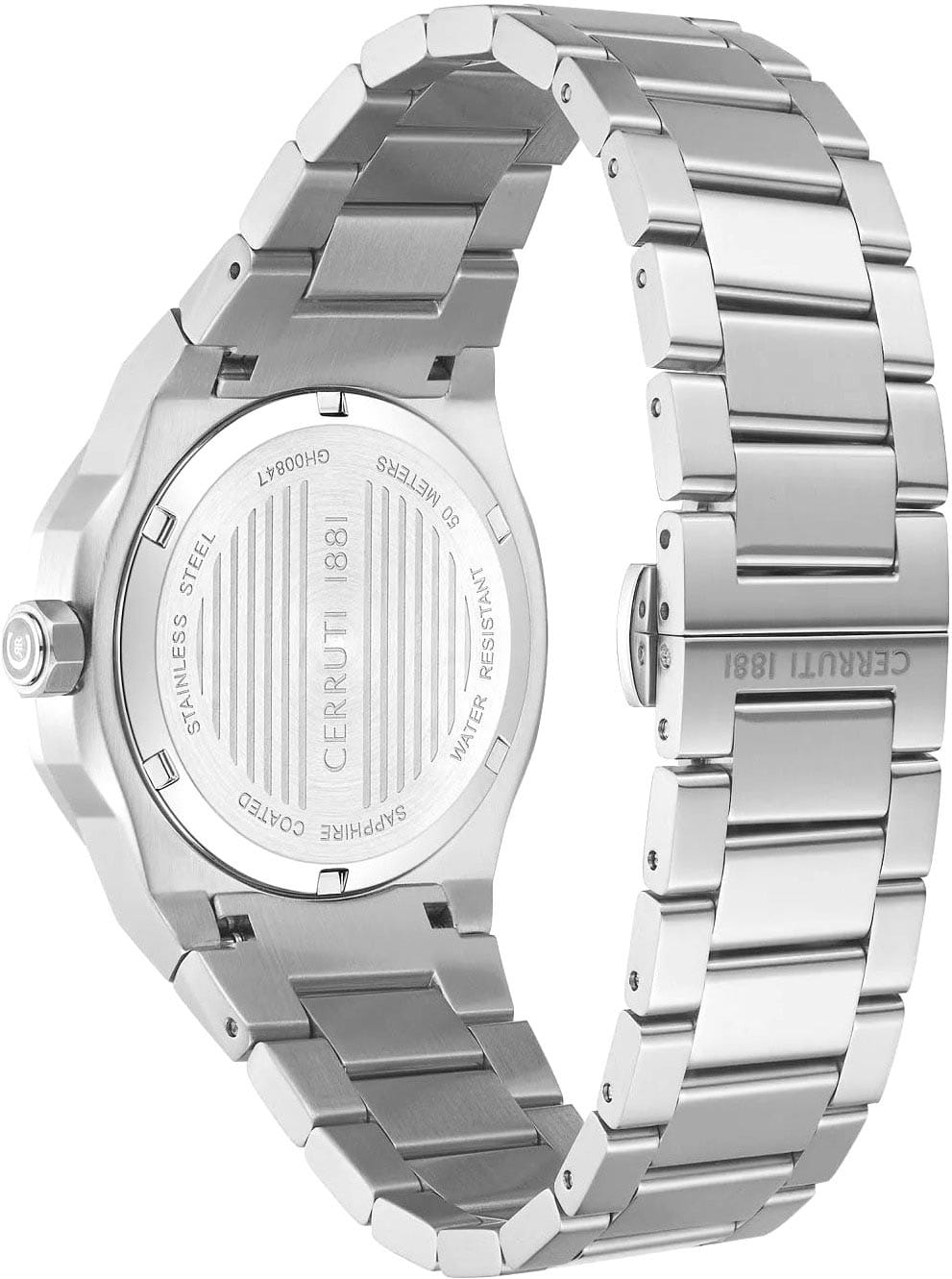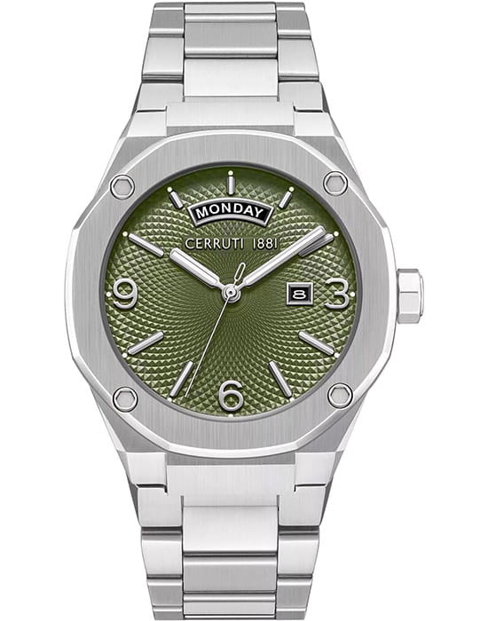 Cerruti 1881 CIWGH0084704 — утончённые мужские часы, в которых классика и современная геометрия нашли безупречный баланс. Стальной корпус с восьмигранным безелемБезельВнешний ободок, закрепляющий стекло. В спортивных часах так называется поворотное кольцо с делениями на циферблате, выполняет роль таймера – замеряет отрезки времени на шкале. Неподвижный безель – элемент декора. Однонаправленно вращающийся безель на дайверских часах позволяет фиксировать моменты погружения и выныривания на поверхность. подчёркивает архитектурную точность форм, а глубокий циферблат с гильошированным узором придаёт модели выразительную глубину. Индикаторы дня недели и даты оформлены в элегантных окнах на «12» и «3 часах», обеспечивая визуальную симметрию и удобство считывания. Прочные стрелки покрыты люминесцентным покрытиемЛюминесцентное покрытиеПозволяет считывать показания времени в темноте. Производители наносят на стрелки, часовые индексы, безель или поверхность циферблата светонакопительный состав, дающий холодное свечение., что гарантирует отличную читаемость даже в темноте. Циферблат защищён надёжным минеральным стекломМинеральное стеклоМинеральное стекло представляет собой искусственно выращенный минерал кварца. Такое стекло отличается особой устойчивостью к повреждениям и царапинам. Уступает по некоторым качествам сапфировому стеклу., устойчивым к царапинам, а стальной браслет фиксируется удобной застёжкой «бабочка»Застёжка "бабочка"Такой вид застёжки дополняется предохранителями, помогающими избежать случайного раскрытия браслета. Обладают изящным исполнением. , обеспечивающей комфорт и безопасность при носке. Строгая форма и продуманные детали делают эту модель идеальным выбором для мужчины, ценящего сдержанную роскошь и точность швейцарского стиля.