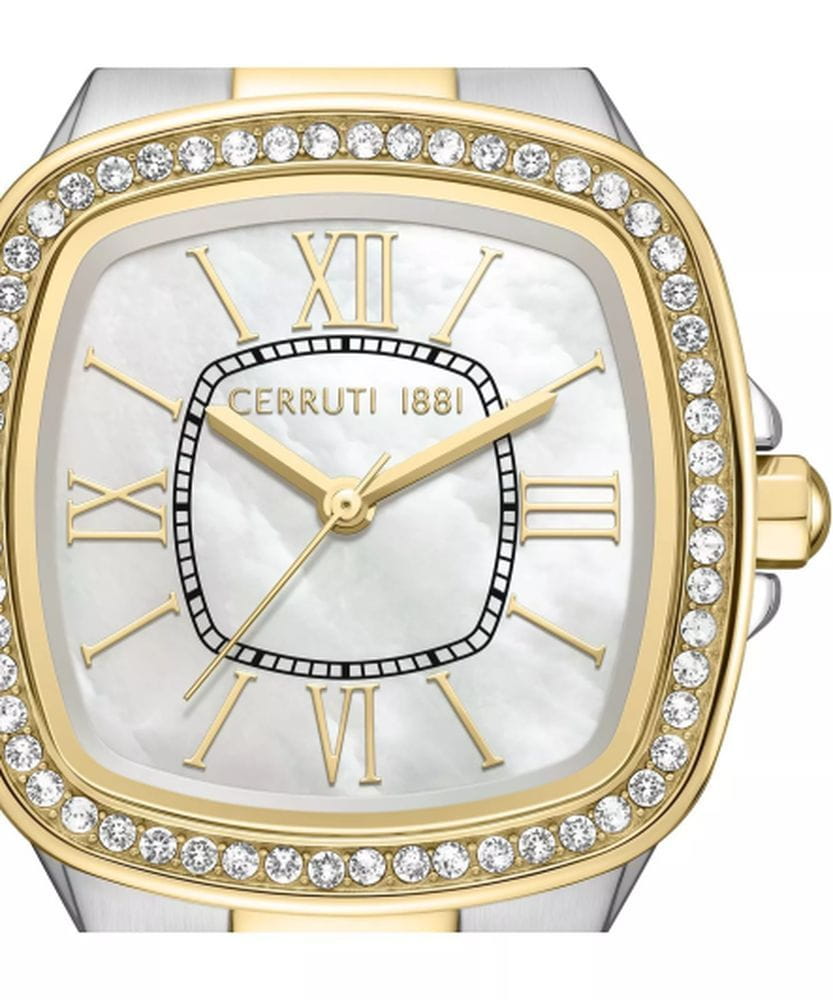 Cerruti 1881 CIWLG0086002 — утончённые женские часы, в которых изысканная гармония форм сочетается с благородным блеском деталей. Корпус из нержавеющей стали, а безельБезельВнешний ободок, закрепляющий стекло. В спортивных часах так называется поворотное кольцо с делениями на циферблате, выполняет роль таймера – замеряет отрезки времени на шкале. Неподвижный безель – элемент декора. Однонаправленно вращающийся безель на дайверских часах позволяет фиксировать моменты погружения и выныривания на поверхность. с IP-покрытиемIP-покрытиеМетод ионного напыления. Демонстрирует повышенную устойчивость к истиранию, окислению и химическим веществам. Под воздействием высокого давления и температуры около 1500°C молекулы металла надёжно соединяются с частицами корпуса часов., украшенный сияющими кристаллами, придаёт модели ювелирное очарование. Перламутровый циферблат с римскими цифрами и гильошированной текстурой создаёт ощущение глубины и мягкого света. Прочное минеральное стеклоМинеральное стеклоМинеральное стекло представляет собой искусственно выращенный минерал кварца. Такое стекло отличается особой устойчивостью к повреждениям и царапинам. Уступает по некоторым качествам сапфировому стеклу. защищает циферблат от повреждений, а металлический браслет с IP-покрытиемIP-покрытиеМетод ионного напыления. Демонстрирует повышенную устойчивость к истиранию, окислению и химическим веществам. Под воздействием высокого давления и температуры около 1500°C молекулы металла надёжно соединяются с частицами корпуса часов. с полированными звеньями оснащён застёжкой «бабочка»Застёжка "бабочка"Такой вид застёжки дополняется предохранителями, помогающими избежать случайного раскрытия браслета. Обладают изящным исполнением. , обеспечивающей элегантное прилегание и комфорт в носке. Cerruti 1881 — воплощение итальянской изысканности и женственности, идеально подходящее для утончённого образа в любой ситуации.