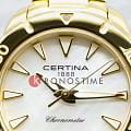 Компактный аксессуар создан по всем правилам дайверской тематики: вращающийся безельБезельВнешний ободок, закрепляющий стекло. В спортивных часах так называется поворотное кольцо с делениями на циферблате, выполняет роль таймера – замеряет отрезки времени на шкале. Неподвижный безель – элемент декора. Однонаправленно вращающийся безель на дайверских часах позволяет фиксировать моменты погружения и выныривания на поверхность., крупная индикация времени, завинчивающаяся заводная головка и задняя крышка. Стильно смотрится золотистый циферблат в сочетании с холодным блеском нержавеющей стали 316L с PVD-покрытиемPVDУльтратонкое покрытие наносится в технике вакуумного напыления, сочетает в себе нитрид титана особой прочности со слоем золота или оксида хрома. Несёт в себе декоративную или защитную функцию.. Часы оснащены швейцарским кварцевым калибром ETA F04.412 Precidrive™Precidrive™Инновационный кварцевый механизм Certina. Часы, оснащённые этим швейцарским калибром, приравниваются к точности к сертифицированным хронометрам, точность хода составляет +/-10 секунд в год., точность хода которого отмечена официальным сертификатом COSCСертификат COSCОфициальный сертификат, подтверждающий то, что часы ходят с особо высокой точностью. Для получения документа часы подвергаются тестовым испытаниям, разработанным швейцарским институтом тестирования хронометров COSC. Допустимая норма для механических часов -4/+6 секунд в день, для кварцевых моделей +/- 0,07 секунд в день.. Модель отличается максимальной водонепроницаемостью 200 метров, сапфировое стекло дополнено антибликовым покрытием. Функции: отображение даты, индикатор EOLEOLПредставляет собой систему, уведомляющую владельца часов о необходимости замены элемента питания. За 2 недели до полного разряда батарейки секундная стрелка перестаёт ходить чётко и начинает перепрыгивать на 3-4 деления.. Диаметр корпуса: 29 мм.