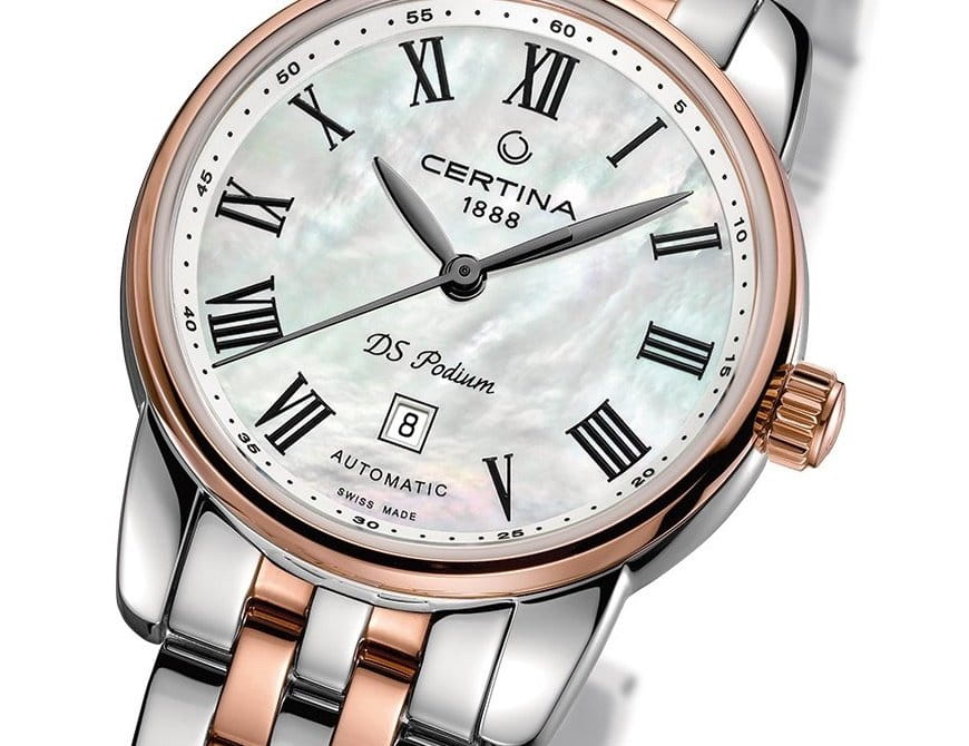Элегантный аксессуар обладает вневременным дизайном, перламутровый циферблат дополнен римскими цифрами с винтажным оттенком. Часы с автоматической системой завода для своей работы используют энергию от движений руки носительницы, позволяя забыть о необходимости регулярного завода. Швейцарский механизм ETA 2671 с 38-часовым запасом хода. Скелетонизированная задняя крышка. Сапфировое стекло с двухсторонней обработкой «антиблик». Концепция Double SecurityDS ConceptDouble Security Concept, обозначает двойную надёжность и безупречную точность часов Certina. Двойная система защиты подразумевает обеспечение максимальной устойчивости к ударам и высоких показателей водонепроницаемости.. Корпус и браслет из нержавеющей стали 316L с PVD-покрытиемPVDУльтратонкое покрытие наносится в технике вакуумного напыления, сочетает в себе нитрид титана особой прочности со слоем золота или оксида хрома. Несёт в себе декоративную или защитную функцию. «розовое золото». Водозащита 100 метров. . Отображение числа. Диаметр корпуса: 29 мм.