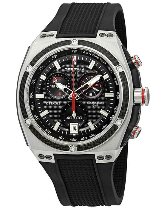 CERTINA C023.739.27.051.00 DS Eagle Quartz Chronograph - мужские кварцевые наручные часы. Корпус этих часов крупного размера (46 мм) и выполнен из нержавеющей стали L316с PVD-покрытием черного цвета. Модель CERTINA C023.739.27.051.00 DS Eagle Quartz Chronograph имеет устойчивое к царапинам сапфировое стекло, ремешок из натурального каучука черного цвета, черный циферблат. Калибр механизма: ETA G10.961. Класс водозащиты: 200 м / 20 АТМ (разрешается нырять с аквалангом на глубину). Дополнительные функции и особенности: отображение числа, второе время (GMT), хронограф (секундомер), тахиметр. Полная заводская комплектация CERTINA: оригинальные часы, фирменная коробка, инструкция, сервисная книжка, кассовый и товарный чеки. Международная гарантия 2 года. Производство и сборка: Швейцария