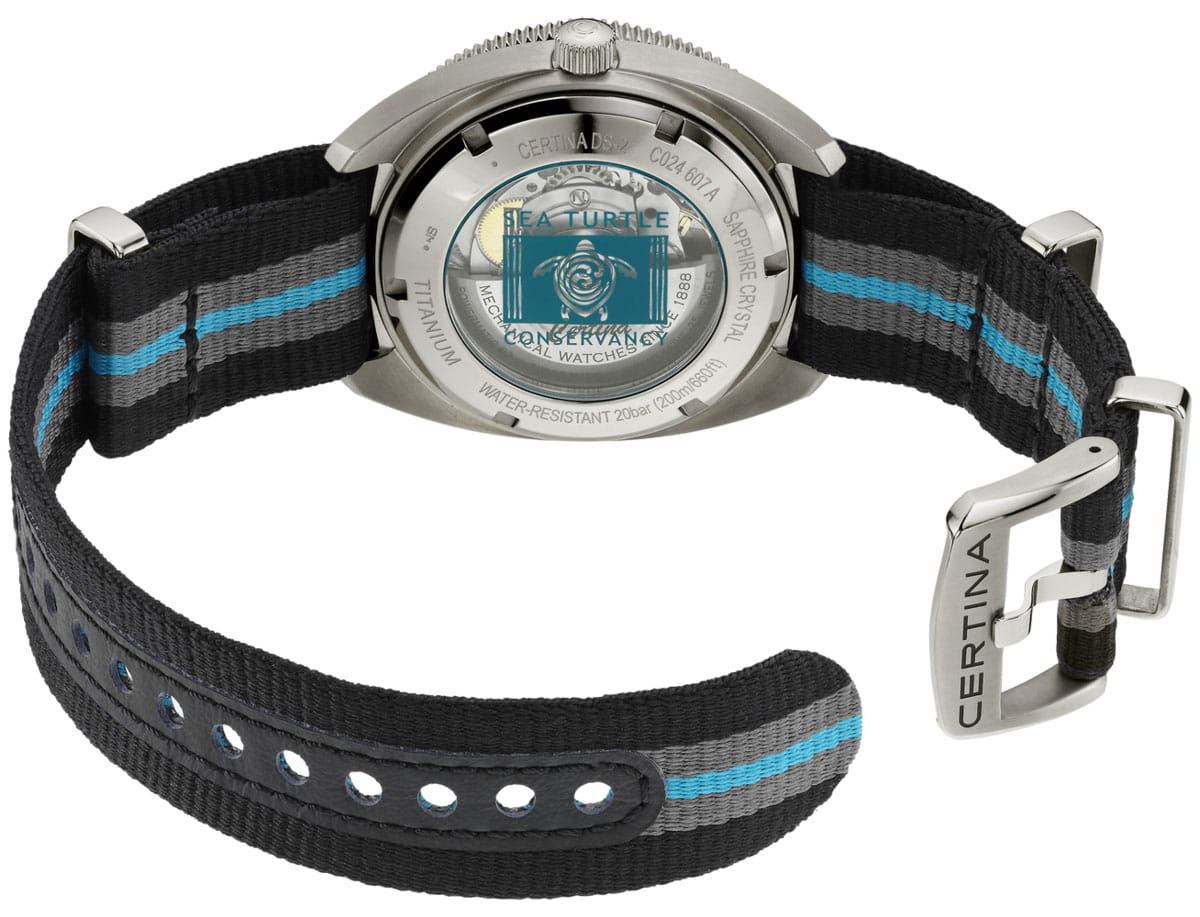 Мужские швейцарские механические часы с автоподзаводом Certina DS Action Diver C024.607.48.051.10, механический механизм (автоматический калибр) с высокой точностью. Сапфировое стеклоСапфировое стеклоПрочный и надёжный материал из кристалла сапфира синтетического происхождения, характеризующийся особой твёрдостью и устойчивостью к царапинам и повреждениям. устойчивое к появлению царапин, обладающее высокой прозрачностью. БезельБезельВнешний ободок, закрепляющий стекло. В спортивных часах так называется поворотное кольцо с делениями на циферблате, выполняет роль таймера – замеряет отрезки времени на шкале. Неподвижный безель – элемент декора. Однонаправленно вращающийся безель на дайверских часах позволяет фиксировать моменты погружения и выныривания на поверхность. из титина и алюминия. Класс водозащиты: 200 метров, позволит плавать, нырять и заниматься другими водными видами спорта. Корпус часов изготовлен из титана.