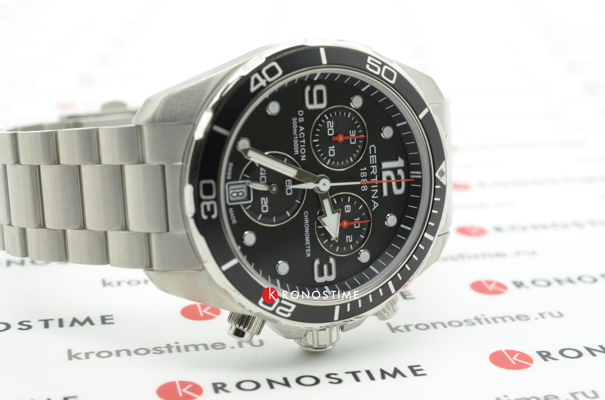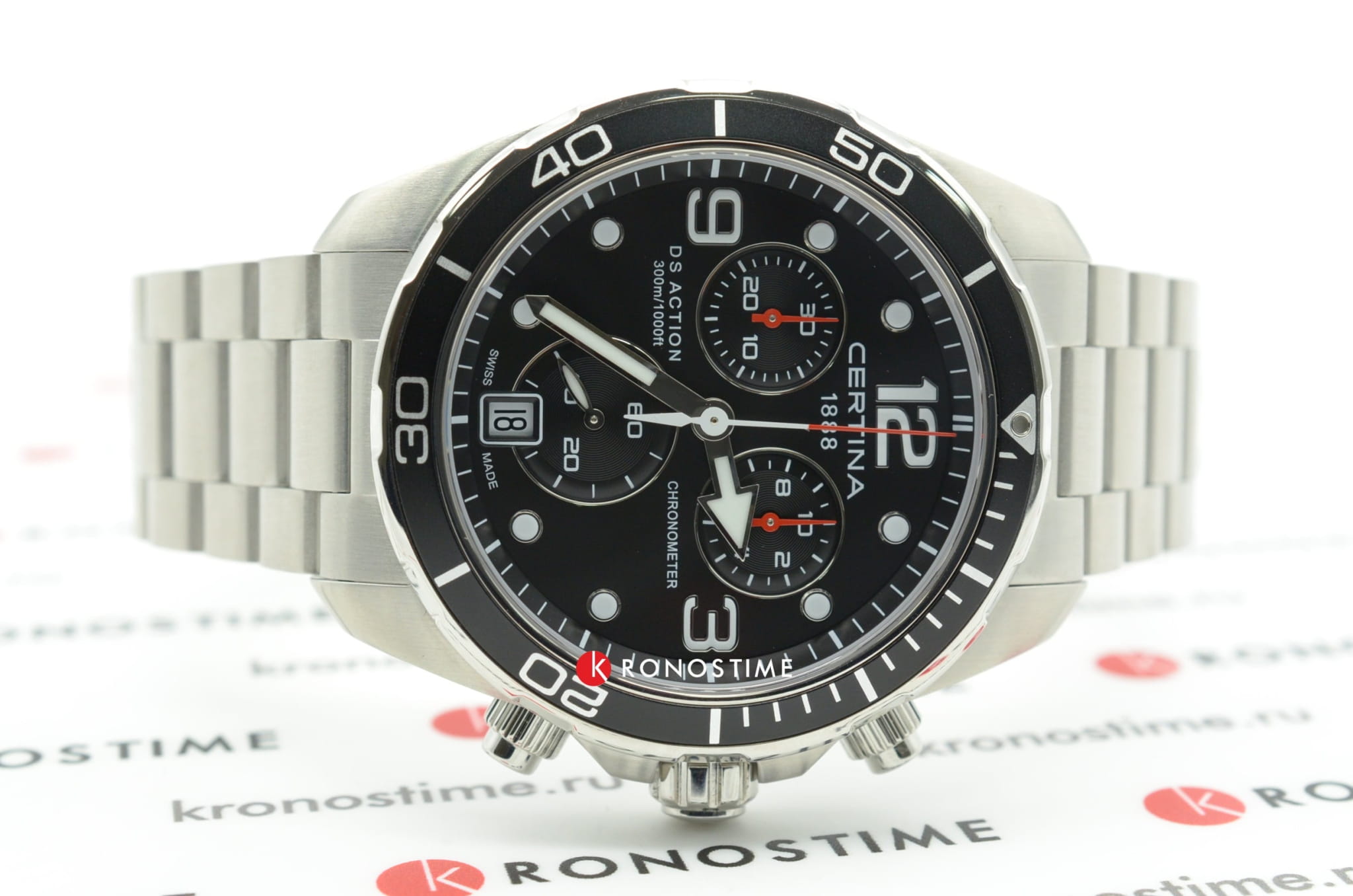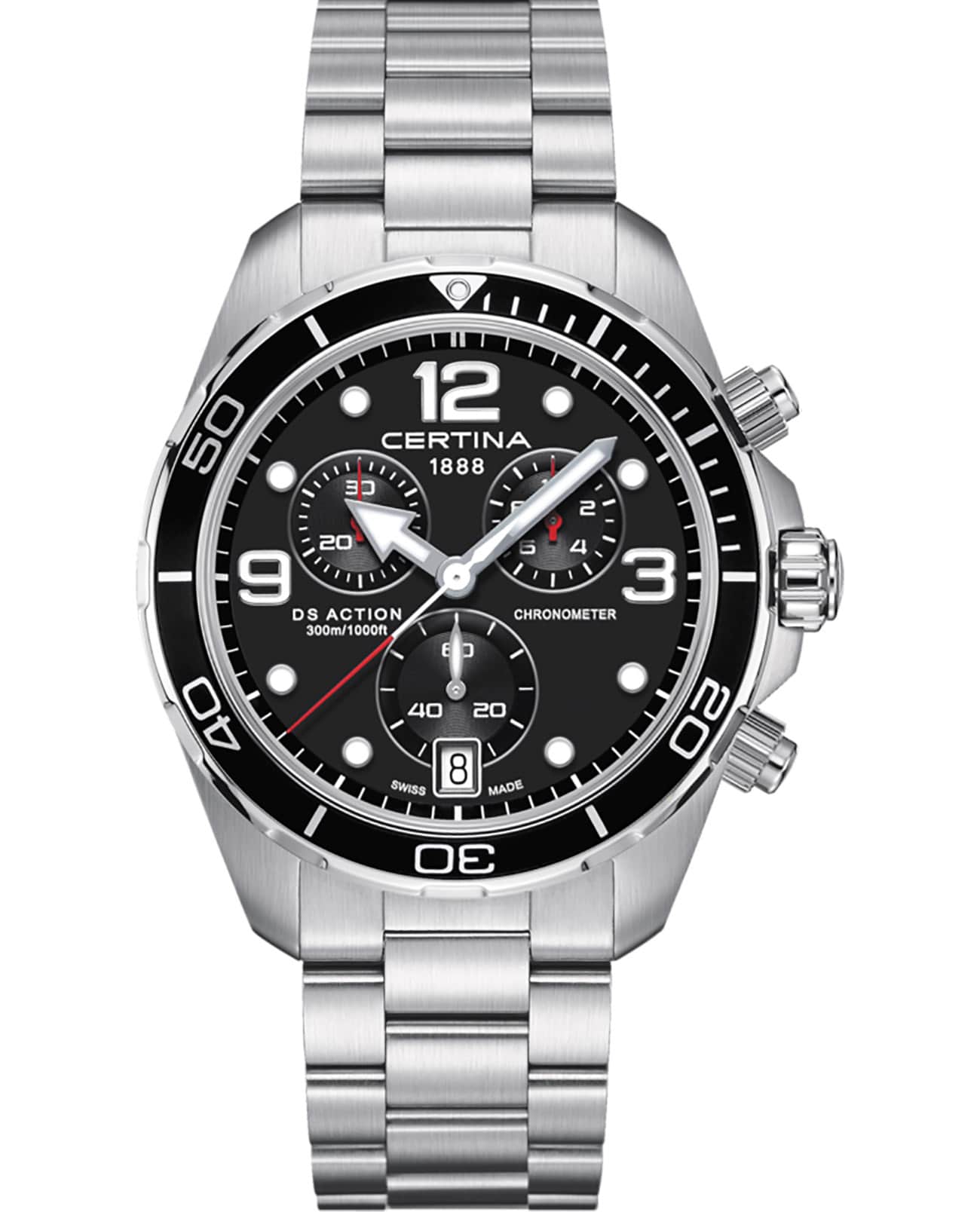 Дайверский хронографХронографФункция позволяет измерять отрезки времени с особой точностью: часы, минуты, секунды. Верным признаком хронографа является наличие на циферблате 3 дополнительных окошек-счётчиков. в чёрно-серебристом исполнении станет идеальным завершением делового, повседневного образа. Аксессуар дополнен безелемБезельВнешний ободок, закрепляющий стекло. В спортивных часах так называется поворотное кольцо с делениями на циферблате, выполняет роль таймера – замеряет отрезки времени на шкале. Неподвижный безель – элемент декора. Однонаправленно вращающийся безель на дайверских часах позволяет фиксировать моменты погружения и выныривания на поверхность. из анодированного алюминия, что облегчает конструкцию часов. Модель сделана из хирургической стали 316L, востребованной благодаря прочности и устойчивости к коррозии. Точность хода швейцарского механизма G10.212 AA PRECIDRIVE приравнивается к хронометрической, что подтверждено сертификатом COSCСертификат COSCОфициальный сертификат, подтверждающий то, что часы ходят с особо высокой точностью. Для получения документа часы подвергаются тестовым испытаниям, разработанным швейцарским институтом тестирования хронометров COSC. Допустимая норма для механических часов -4/+6 секунд в день, для кварцевых моделей +/- 0,07 секунд в день.. Улучшению читаемости показателей в солнечные дни способствует антибликовое покрытие сапфирового стекла. Максимальная водостойкость 300 метров. Концепция DSDS ConceptDouble Security Concept, обозначает двойную надёжность и безупречную точность часов Certina. Двойная система защиты подразумевает обеспечение максимальной устойчивости к ударам и высоких показателей водонепроницаемости.. Люминесцентная подсветкаЛюминесцентное покрытиеПозволяет считывать показания времени в темноте. Производители наносят на стрелки, часовые индексы, безель или поверхность циферблата светонакопительный состав, дающий холодное свечение.. Секундомер, отображение даты. Диаметр корпуса: 43 мм.