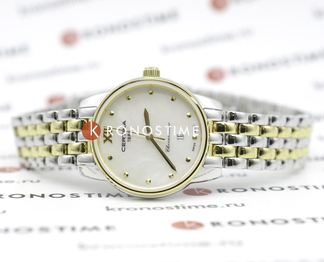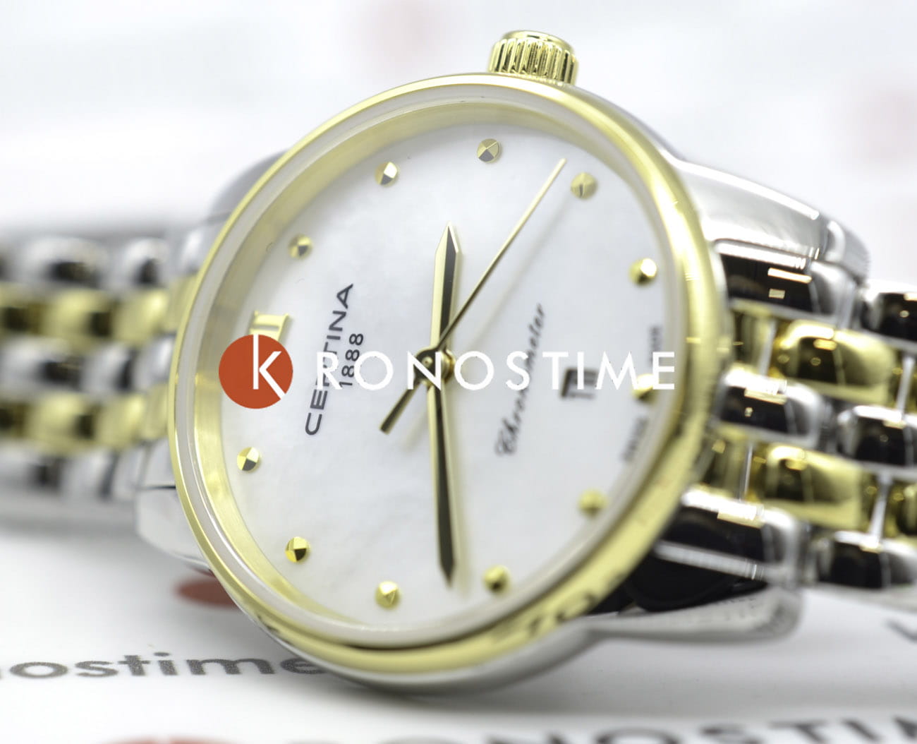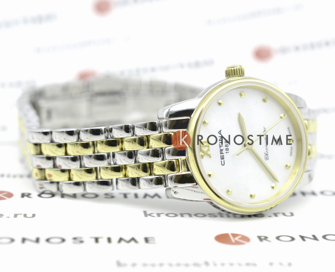 Изысканный аксессуар – лучший вариант для делового костюма или вечернего наряда. Эффектный перламутровый циферблат, бело-серого цвета дополнен незатейливым узором и золотистой часовой разметкой. Часы привлекают не только дизайном, но и абсолютной точностью: швейцарский кварцевый механизм ETA F03.412 Precidrive™Precidrive™Инновационный кварцевый механизм Certina. Часы, оснащённые этим швейцарским калибром, приравниваются к точности к сертифицированным хронометрам, точность хода составляет +/-10 секунд в год. удостоился официального сертификата COSCСертификат COSCОфициальный сертификат, подтверждающий то, что часы ходят с особо высокой точностью. Для получения документа часы подвергаются тестовым испытаниям, разработанным швейцарским институтом тестирования хронометров COSC. Допустимая норма для механических часов -4/+6 секунд в день, для кварцевых моделей +/- 0,07 секунд в день.. Система DS ConceptDS ConceptDouble Security Concept, обозначает двойную надёжность и безупречную точность часов Certina. Двойная система защиты подразумевает обеспечение максимальной устойчивости к ударам и высоких показателей водонепроницаемости.. Противокоррозионная сталь 316L с PVD-покрытиемPVDУльтратонкое покрытие наносится в технике вакуумного напыления, сочетает в себе нитрид титана особой прочности со слоем золота или оксида хрома. Несёт в себе декоративную или защитную функцию.. Степень водозащиты WR 100. Сапфировое стеклоСапфировое стеклоПрочный и надёжный материал из кристалла сапфира синтетического происхождения, характеризующийся особой твёрдостью и устойчивостью к царапинам и повреждениям. с антибликовой обработкой. Застёжка «бабочка» с кнопкамиЗастёжка "бабочка"Такой вид застёжки дополняется предохранителями, помогающими избежать случайного раскрытия браслета. Обладают изящным исполнением. . Отображение числа, индикатор EOLEOLПредставляет собой систему, уведомляющую владельца часов о необходимости замены элемента питания. За 2 недели до полного разряда батарейки секундная стрелка перестаёт ходить чётко и начинает перепрыгивать на 3-4 деления.. Диаметр корпуса: 27,5 мм.