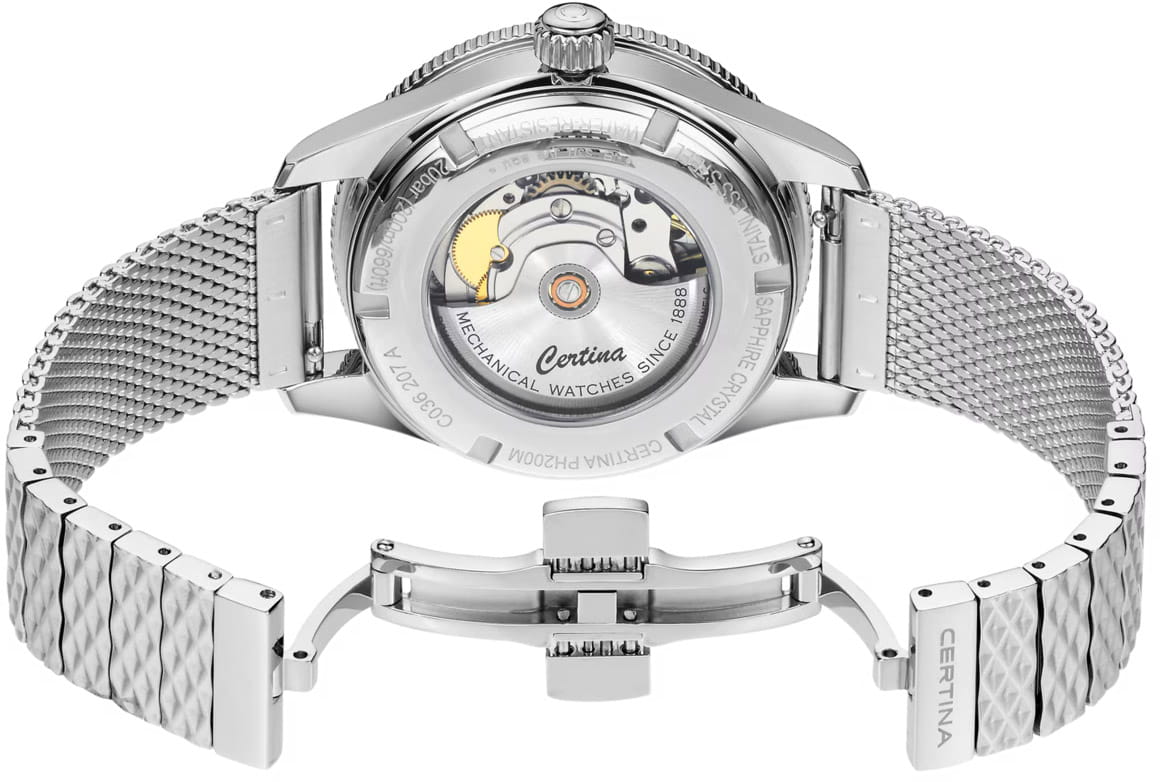 Женские механические часы с автоподзаводом Certina из коллекции DS PH200M — это сочетание надежности, элегантности и дайверского стиля. Корпус диаметром 39 мм и толщиной 11,9 мм выполнен из нержавеющей стали 316L с элементами керамики. Циферблат коричневого цвета оформлен индексами в виде меток и украшен 11 бриллиантами, придающими изделию роскошный вид. Окошко даты расположено в положении 3 часов. Циферблат защищён сапфировым стекломСапфировое стеклоПрочный и надёжный материал из кристалла сапфира синтетического происхождения, характеризующийся особой твёрдостью и устойчивостью к царапинам и повреждениям. с антибликовым покрытиемАнтибликовое покрытиеСлой оксида металла в 0,13-0,3 микрон, благодаря которому стекло часов не бликует и не отражает свет. Антибликовое покрытие уменьшает отражение света в 10 раз, обеспечивая отличную читаемость показателей циферблата., устойчивым к царапинам. Механизм — автоматический калибр Powermatic 80 с антимагнитной пружиной Nivachron™Nivachron™Специально разработанный инновационный сплав Nivachron™ повышает устойчивость часов к воздействию магнитных полей. и запасом хода 80 часов. Прозрачная задняя крышка открывает вид на механизм. Часы оснащены стальным браслетом миланского плетения на застёжке «бабочка» с кнопкамиЗастёжка "бабочка"Такой вид застёжки дополняется предохранителями, помогающими избежать случайного раскрытия браслета. Обладают изящным исполнением. . Завинчивающаяся коронка обеспечивает дополнительную защиту. Водонепроницаемость 200 м позволяет использовать часы для плавания и дайвинга. Гарантия — 24 месяца. Идеальный выбор для тех, кто ценит швейцарское качество, стиль и функциональность.