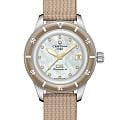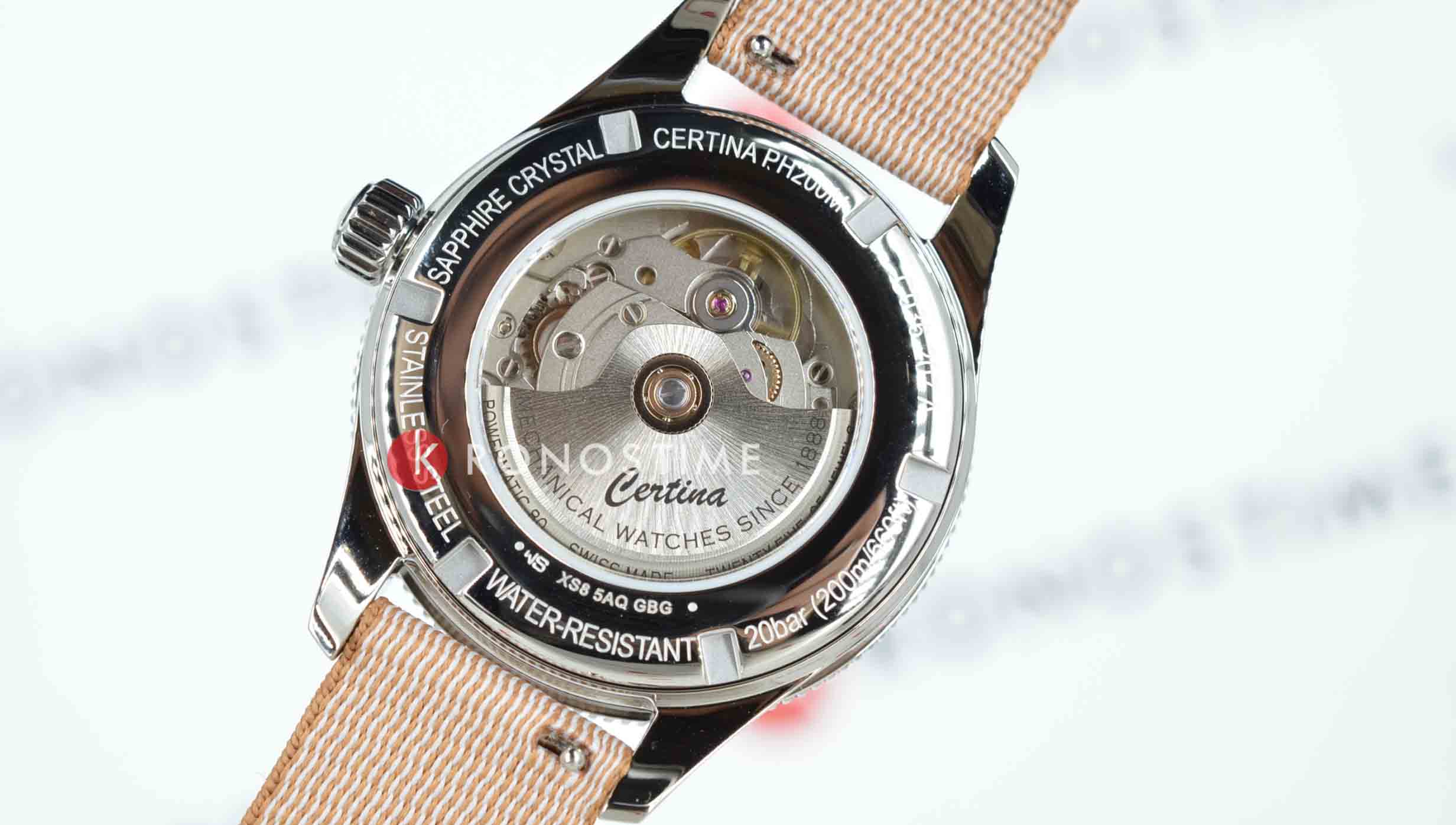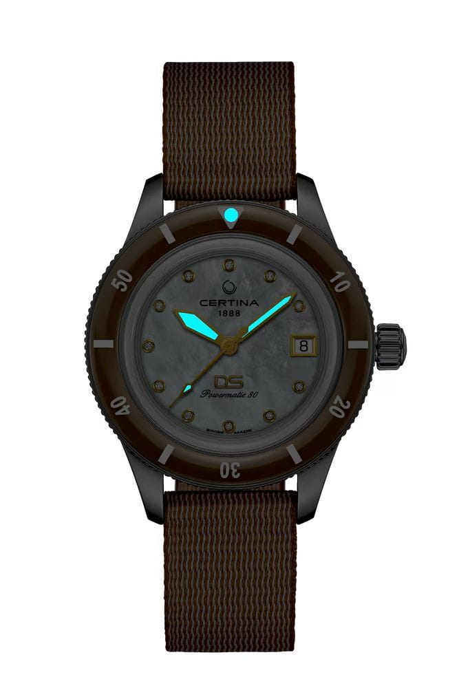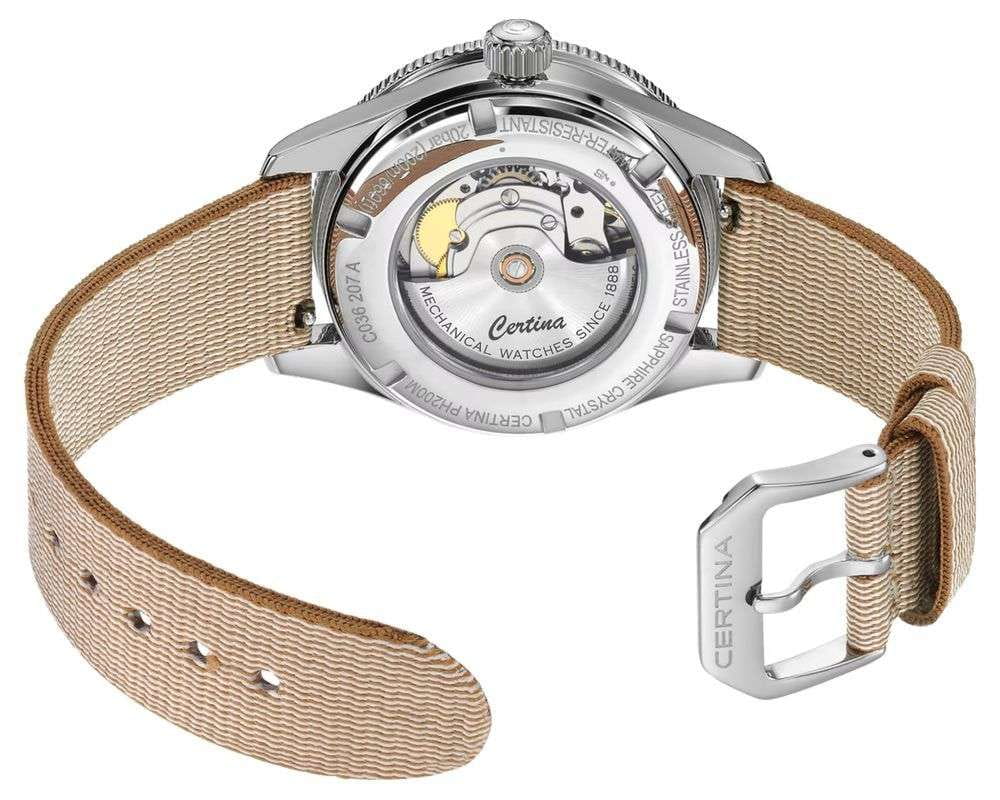Модель Certina C036.207.18.116.00 из коллекции DS PH200M сочетает в себе элегантный дизайн и высокие технические характеристики. Корпус диаметром 39 мм выполнен из нержавеющей стали 316L, обеспечивая прочность и устойчивость к коррозии. Циферблат из белого перламутра украшен одиннадцатью бриллиантами и дополнен стрелками и индексами с покрытием из розового золота, покрытыми люминесцентным покрытиемЛюминесцентное покрытиеПозволяет считывать показания времени в темноте. Производители наносят на стрелки, часовые индексы, безель или поверхность циферблата светонакопительный состав, дающий холодное свечение. для отличной читаемости в темноте.