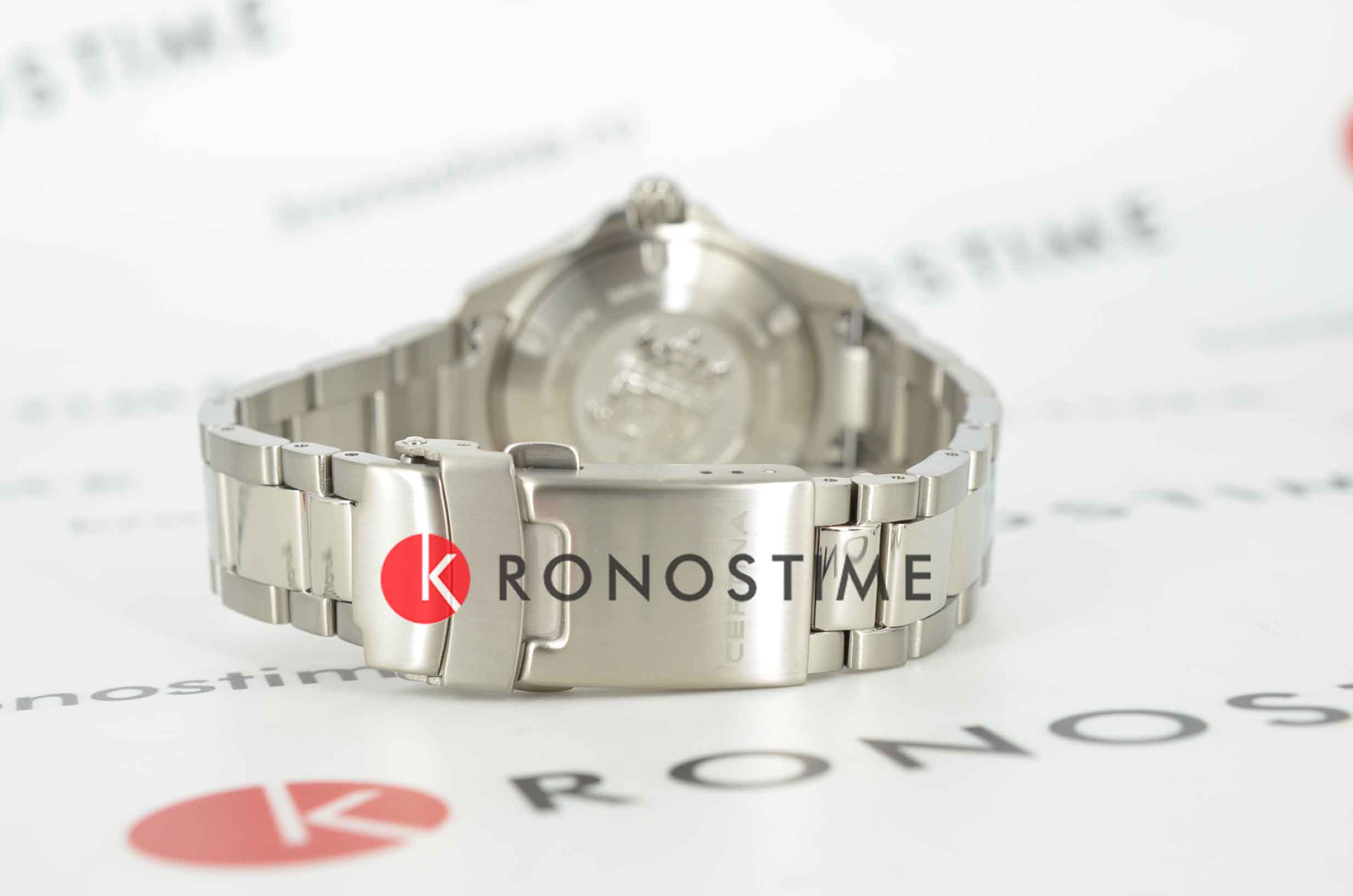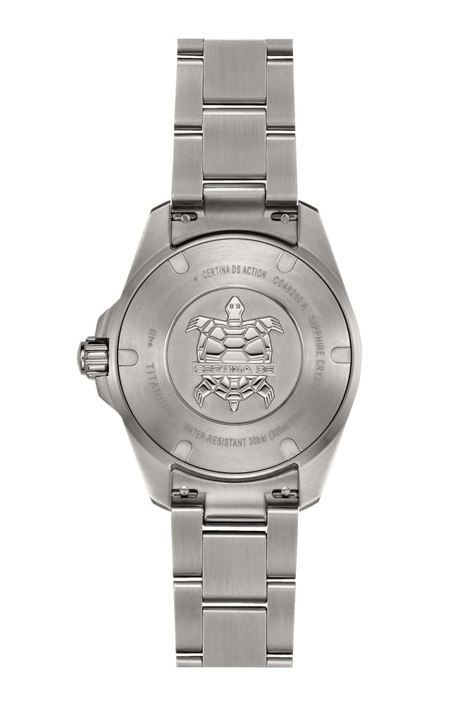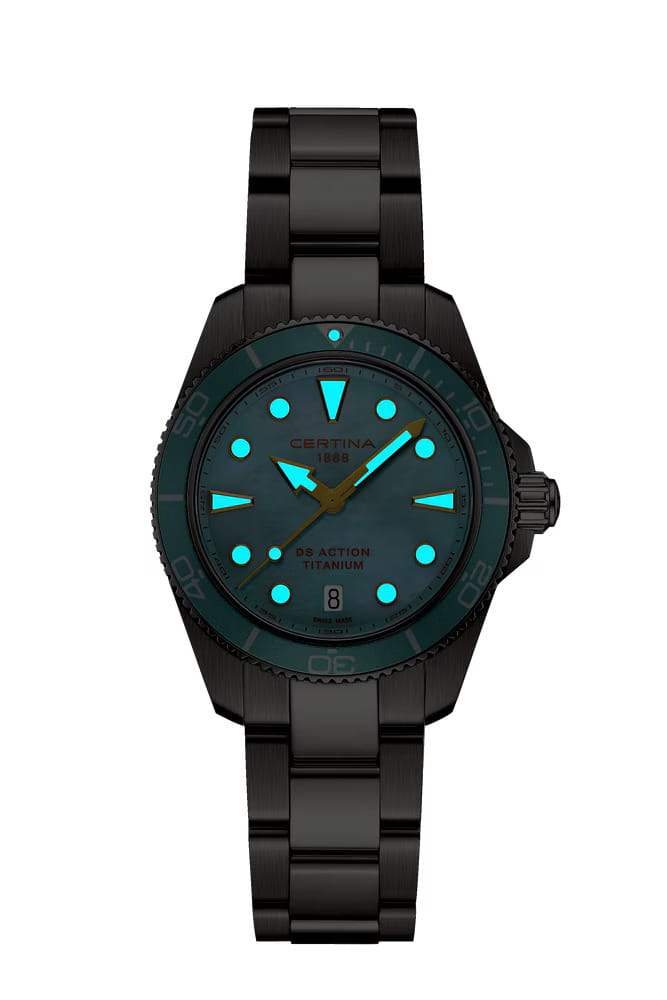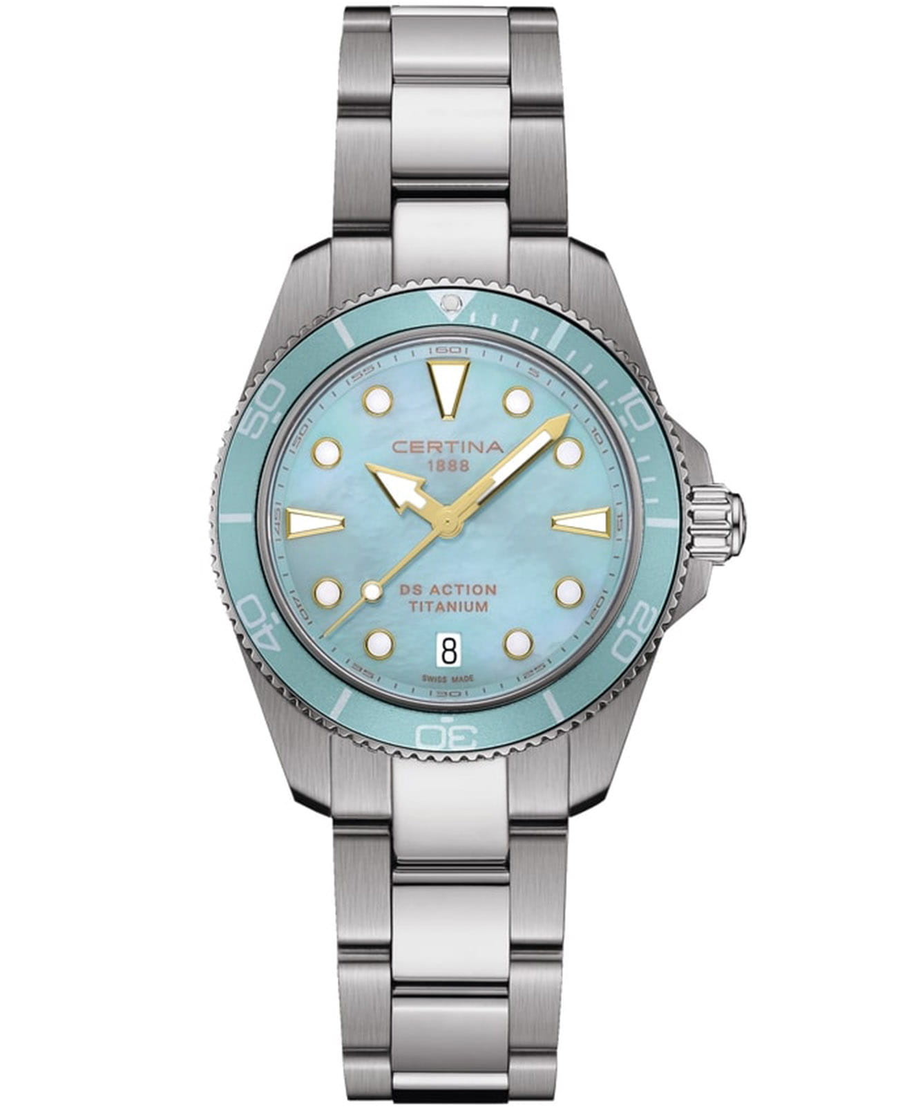 Certina DS Action Lady C048.210.44.131.00 – элегантные женские часы, сочетающие изысканный стиль и высокую функциональность. Корпус диаметром 34,5 мм выполнен из титана, что обеспечивает лёгкость, прочность и гипоаллергенные свойства. Перламутровый циферблат украшен метками с люминесцентным покрытиемЛюминесцентное покрытиеПозволяет считывать показания времени в темноте. Производители наносят на стрелки, часовые индексы, безель или поверхность циферблата светонакопительный состав, дающий холодное свечение., обеспечивающим отличную читаемость в любых условиях, и защищён сапфировым стекломСапфировое стеклоПрочный и надёжный материал из кристалла сапфира синтетического происхождения, характеризующийся особой твёрдостью и устойчивостью к царапинам и повреждениям. с антибликовым покрытиемАнтибликовое покрытиеСлой оксида металла в 0,13-0,3 микрон, благодаря которому стекло часов не бликует и не отражает свет. Антибликовое покрытие уменьшает отражение света в 10 раз, обеспечивая отличную читаемость показателей циферблата., устойчивым к царапинам. БезельБезельВнешний ободок, закрепляющий стекло. В спортивных часах так называется поворотное кольцо с делениями на циферблате, выполняет роль таймера – замеряет отрезки времени на шкале. Неподвижный безель – элемент декора. Однонаправленно вращающийся безель на дайверских часах позволяет фиксировать моменты погружения и выныривания на поверхность. с PVD-покрытиемPVDУльтратонкое покрытие наносится в технике вакуумного напыления, сочетает в себе нитрид титана особой прочности со слоем золота или оксида хрома. Несёт в себе декоративную или защитную функцию.. Часы оснащены швейцарским кварцевым механизмом ETA F05.412 с технологией Precidrive™Precidrive™Инновационный кварцевый механизм Certina. Часы, оснащённые этим швейцарским калибром, приравниваются к точности к сертифицированным хронометрам, точность хода составляет +/-10 секунд в год., обеспечивающей высокую точность хода. Функция EOLEOLПредставляет собой систему, уведомляющую владельца часов о необходимости замены элемента питания. За 2 недели до полного разряда батарейки секундная стрелка перестаёт ходить чётко и начинает перепрыгивать на 3-4 деления. (индикатор окончания заряда батареи) своевременно предупреждает о необходимости замены элемента питания. Браслет из титана оснащён системой быстрой замены, позволяющей легко менять ремешки без использования инструментов. Водонепроницаемость 300 метров (30 бар) делает эту модель идеальным выбором для плавания и дайвинга.