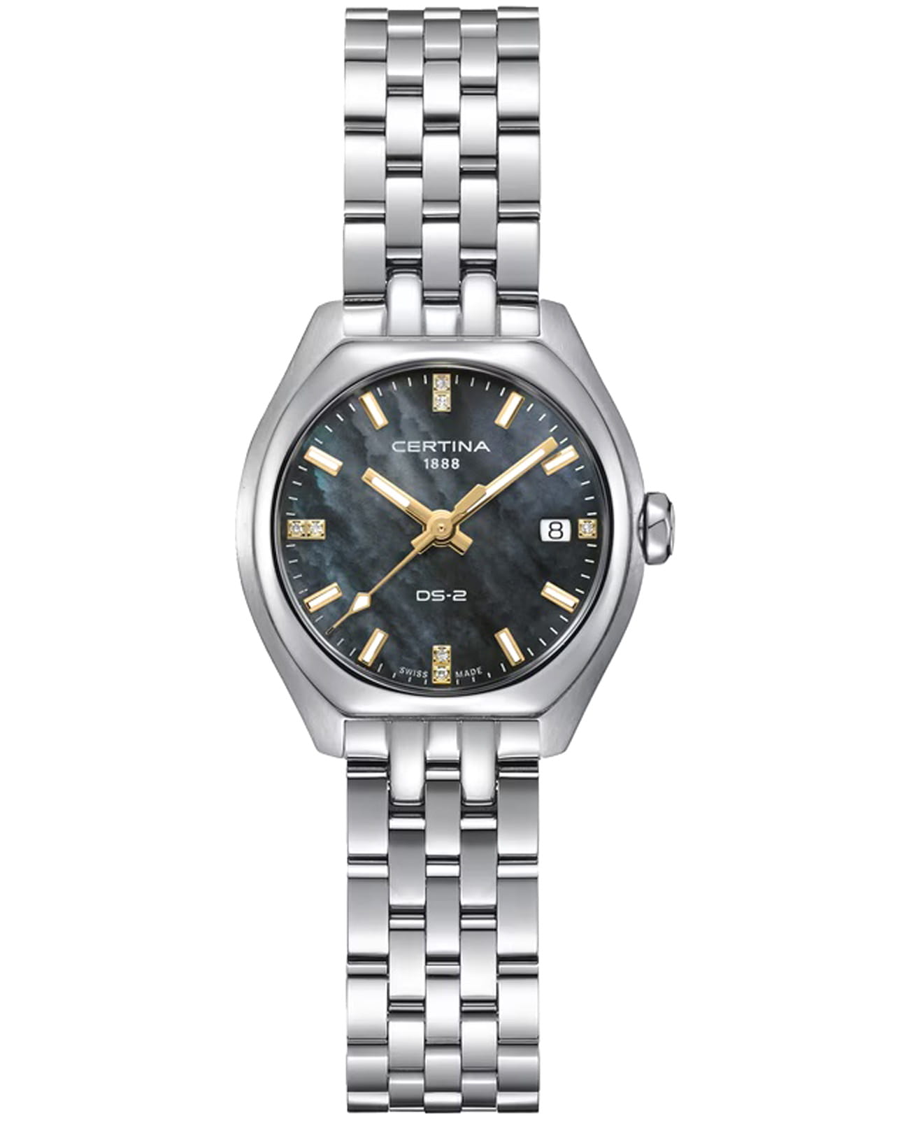 Швейцарские кварцевые часы Certina DS-2 Lady C049.210.11.126.01 - это элегантные женские часы, сочетающие в себе классический дизайн и современные технологии. Их утонченный внешний вид подчеркивается перламутровым циферблатом с индексами, швейцарский кварцевый механизм обеспечивает высокую точность измерения времени. Сапфировое стеклоСапфировое стеклоПрочный и надёжный материал из кристалла сапфира синтетического происхождения, характеризующийся особой твёрдостью и устойчивостью к царапинам и повреждениям. с антибликовым покрытиемАнтибликовое покрытиеСлой оксида металла в 0,13-0,3 микрон, благодаря которому стекло часов не бликует и не отражает свет. Антибликовое покрытие уменьшает отражение света в 10 раз, обеспечивая отличную читаемость показателей циферблата. устойчивое к появлению царапин, обладающее высокой прозрачностью. Корпус изготовлен из нержавеющей стали 316L, которая чрезвычайно прочна, устойчива к коррозии и гипоаллергенна. Стрелки и метки с люминесцентным покрытиемЛюминесцентное покрытиеПозволяет считывать показания времени в темноте. Производители наносят на стрелки, часовые индексы, безель или поверхность циферблата светонакопительный состав, дающий холодное свечение. Superluminova обеспечивают хорошую видимость в темное время суток. Окошко даты находится в положении 3 часа. Класс водозащиты: 100 метров, позволит плавать, нырять и заниматься другими водными видами спорта. Стальной браслет на застёжке-бабочке с кнопкамиЗастёжка "бабочка"Такой вид застёжки дополняется предохранителями, помогающими избежать случайного раскрытия браслета. Обладают изящным исполнением. обеспечивает комфортное ношение на запястье. Эти часы станут идеальным дополнением как к деловому образу, так и к вечернему наряду, придавая вашему стилю нотку изысканности.