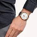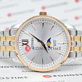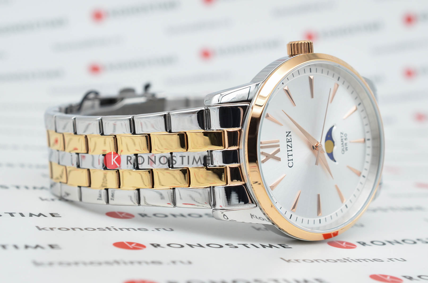 Часы Citizen AK5006-58A произведены в Японии и оснащены надёжным кварцевым механизмом калибра Citizen 6324. Корпус выполнен из нержавеющей стали и имеет классическую круглую форму диаметром 42 мм, а безельБезельВнешний ободок, закрепляющий стекло. В спортивных часах так называется поворотное кольцо с делениями на циферблате, выполняет роль таймера – замеряет отрезки времени на шкале. Неподвижный безель – элемент декора. Однонаправленно вращающийся безель на дайверских часах позволяет фиксировать моменты погружения и выныривания на поверхность. с элегантным золотистым IP-покрытиемIP-покрытиеМетод ионного напыления. Демонстрирует повышенную устойчивость к истиранию, окислению и химическим веществам. Под воздействием высокого давления и температуры около 1500°C молекулы металла надёжно соединяются с частицами корпуса часов.. Минеральное стеклоМинеральное стеклоМинеральное стекло представляет собой искусственно выращенный минерал кварца. Такое стекло отличается особой устойчивостью к повреждениям и царапинам. Уступает по некоторым качествам сапфировому стеклу. защищает серебристый циферблат, украшенный эффектом солнечных лучей по технологии Sunray. На циферблате расположены клиновидные стрелки в стиле Dauphine, метки в виде штрихов и римская цифра в положении 12 часов, а также индикатор фазы Луны — одно из самых востребованных усложнений в часовой классике. Часы защищены от воды по стандарту 50WR, что позволяет не бояться случайных брызг и дождя. Заводная головка отличается рифлёной поверхностью для удобства использования. Стальной браслет с частичным золотистым IP-покрытиемIP-покрытиеМетод ионного напыления. Демонстрирует повышенную устойчивость к истиранию, окислению и химическим веществам. Под воздействием высокого давления и температуры около 1500°C молекулы металла надёжно соединяются с частицами корпуса часов. и раскладной застёжкойРаскладная застёжкаТакой тип застёжки используется только на браслетах из металла. Она никогда не раскрывается полностью, происходит разделение на 2 и более частей. Раскладывающая застёжка снизит вероятность потери часов к минимуму. обеспечивает комфорт и надежную фиксацию на руке. В качестве элемента питания используется батарейка SR621SW, обеспечивающая автономную работу до двух лет.