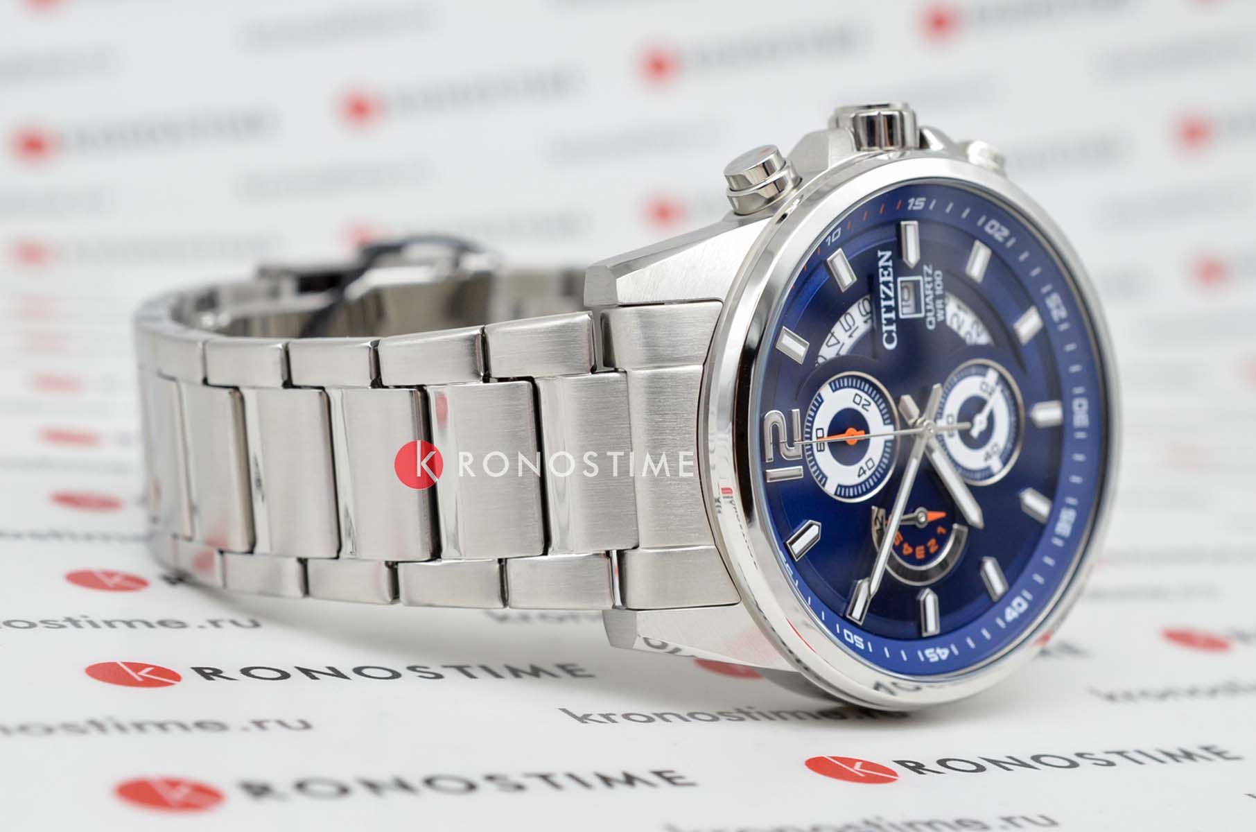 Citizen Chronograph AN3690-56L часы-хронографХронографФункция позволяет измерять отрезки времени с особой точностью: часы, минуты, секунды. Верным признаком хронографа является наличие на циферблате 3 дополнительных окошек-счётчиков. с секундомеромСекундомерСекундоме́р — прибор, способный измерять интервалы времени с точностью до долей секунды. спортивного дизайна с высоким уровнем водозащиты. Корпус из нержавеющей стали диаметром 44 мм идеально сбалансирован. Минеральное стеклоМинеральное стеклоМинеральное стекло представляет собой искусственно выращенный минерал кварца. Такое стекло отличается особой устойчивостью к повреждениям и царапинам. Уступает по некоторым качествам сапфировому стеклу. обеспечивает отличную защиту циферблата от царапин. Часы работают на основе кварцевого механизма. Стальной браслет на раскладной застёжкеРаскладная застёжкаТакой тип застёжки используется только на браслетах из металла. Она никогда не раскрывается полностью, происходит разделение на 2 и более частей. Раскладывающая застёжка снизит вероятность потери часов к минимуму. идеально дополняют дизайн часов, обеспечивая комфортное ношение. Секундомер с точностью 1с и временем измерения 12ч отображается центральной стрелкой. Циферблат с метками в виде штрихов выполнен по технологии Sunray (солнечные лучи). Окошко даты находится в положении 3 часа. Заводная головка с защитой. Часы обладают впечатляющей водонепроницаемостью до 100WR, что делает их идеальными для повседневной носки.