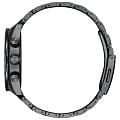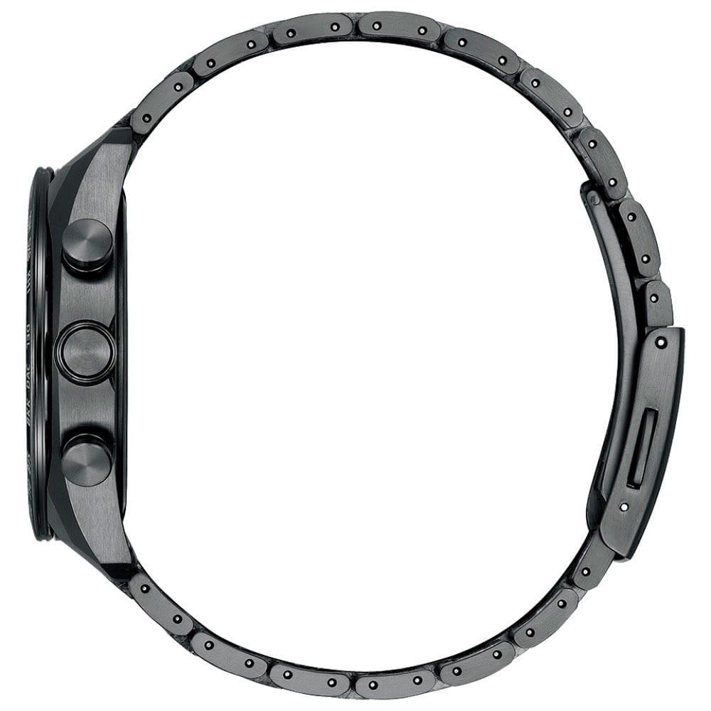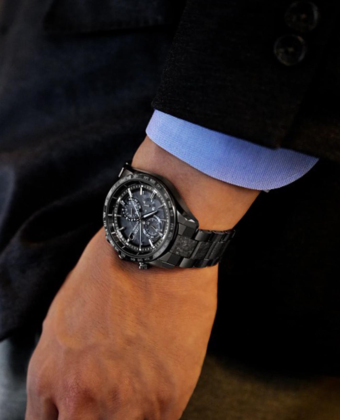 Citizen AT8287-62E — современные японские часы с кварцевым хронографомХронографФункция позволяет измерять отрезки времени с особой точностью: часы, минуты, секунды. Верным признаком хронографа является наличие на циферблате 3 дополнительных окошек-счётчиков. и секундомеромСекундомерСекундоме́р — прибор, способный измерять интервалы времени с точностью до долей секунды., выполненные в элегантном корпусе из титана с черным DLC-покрытиемDLC-покрытиеDiamond like carbon - одно из лучших видов покрытия, представляющее собой углерод с алмазными свойствами. На поверхность материала наносятся распавшиеся молекулы углерода, превращающиеся в плёнку из алмазоподобных связей, которая перенимает твёрдость алмаза. диаметром 42 мм и толщиной 11 мм. Модель оснащена инновационной технологией Eco-Drive, которая позволяет заряжать часы от солнечного света и обеспечивает запас хода до 180 дней, а при активации функции энергосбережения — до 10 месяцев без дополнительной подзарядки. Часы поддерживают автоматическую настройку времени по радиосигналу в Германии, Японии, США и Китае, а также позволяют отображать мировое времяМировое время Полезное часовое усложнение, отображающее время в основных городах и известных областях по всему миру, оно связано с часовыми поясами, удобно для путешественников и бизнесменов. для 26 городов и легко переключаться между летним и стандартным временем. Функционал включает индикацию даты и дня недели, а стрелки и часовые метки с люминесцентным покрытиемЛюминесцентное покрытиеПозволяет считывать показания времени в темноте. Производители наносят на стрелки, часовые индексы, безель или поверхность циферблата светонакопительный состав, дающий холодное свечение. обеспечивают отличную видимость в темноте. Прочное сапфировое стеклоСапфировое стеклоПрочный и надёжный материал из кристалла сапфира синтетического происхождения, характеризующийся особой твёрдостью и устойчивостью к царапинам и повреждениям. с антибликовым покрытиемАнтибликовое покрытиеСлой оксида металла в 0,13-0,3 микрон, благодаря которому стекло часов не бликует и не отражает свет. Антибликовое покрытие уменьшает отражение света в 10 раз, обеспечивая отличную читаемость показателей циферблата. устойчиво к появлению царапин и защищает лаконичный циферблат с индексами в виде штрихов. Титановый браслет с черным DLC-покрытиемDLC-покрытиеDiamond like carbon - одно из лучших видов покрытия, представляющее собой углерод с алмазными свойствами. На поверхность материала наносятся распавшиеся молекулы углерода, превращающиеся в плёнку из алмазоподобных связей, которая перенимает твёрдость алмаза. и с раскладной застёжкойРаскладная застёжкаТакой тип застёжки используется только на браслетах из металла. Она никогда не раскрывается полностью, происходит разделение на 2 и более частей. Раскладывающая застёжка снизит вероятность потери часов к минимуму. гармонично дополняет корпус, подчеркивая премиальный стиль модели. Водозащита уровня WR 100 позволяет использовать часы в повседневной жизни, в том числе во время плавания без погружения. Ограниченная серия 2900 экземпляров.