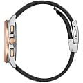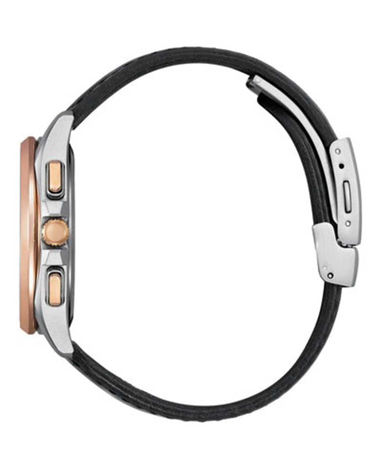 Часы Citizen BY1004-17X — это гармоничное сочетание современного японского стиля, передовых технологий и высокого уровня надежности. Модель выполнена в прочном и легком корпусе из инновационного суперлегкого титана Super Titanium Duratect TIC диаметром 41,5 мм и толщиной 10,8 мм, дополненном черны кожаным ремешком с раскладной застёжкойРаскладная застёжкаТакой тип застёжки используется только на браслетах из металла. Она никогда не раскрывается полностью, происходит разделение на 2 и более частей. Раскладывающая застёжка снизит вероятность потери часов к минимуму. подчеркивает солидный внешний вид модели. БезельБезельВнешний ободок, закрепляющий стекло. В спортивных часах так называется поворотное кольцо с делениями на циферблате, выполняет роль таймера – замеряет отрезки времени на шкале. Неподвижный безель – элемент декора. Однонаправленно вращающийся безель на дайверских часах позволяет фиксировать моменты погружения и выныривания на поверхность. с элегантным золотистым DLC-покрытиемDLC-покрытиеDiamond like carbon - одно из лучших видов покрытия, представляющее собой углерод с алмазными свойствами. На поверхность материала наносятся распавшиеся молекулы углерода, превращающиеся в плёнку из алмазоподобных связей, которая перенимает твёрдость алмаза.. Кварцевый механизм калибра Citizen H874 оснащен системой Eco-Drive, которая работает на солнечной энергии, не требуя замены батарейки, и обеспечивает запас хода до 180 дней. Часы отличаются высокой точностью хода — отклонение составляет всего +/- 15 секунд в месяц. Среди функциональных особенностей — автоматическая настройка времени по радиосигналу для Германии, Японии, США и Китая, вечный календарь, функция мирового времениМировое время Полезное часовое усложнение, отображающее время в основных городах и известных областях по всему миру, оно связано с часовыми поясами, удобно для путешественников и бизнесменов. , 12/24-часовой формат, автоматическое переключение летнего и зимнего времени, а также уникальный полностью автоматизированный радиоуправляемый механизм определения фаз Луны с возможностью отображения как для северного, так и южного полушария. На черном циферблате расположена апертура даты в положении 4 часа, все стрелки с люминесцентным покрытиемЛюминесцентное покрытиеПозволяет считывать показания времени в темноте. Производители наносят на стрелки, часовые индексы, безель или поверхность циферблата светонакопительный состав, дающий холодное свечение. для отличной читаемости в любое время суток. Устойчивое к царапинам сапфировое стеклоСапфировое стеклоПрочный и надёжный материал из кристалла сапфира синтетического происхождения, характеризующийся особой твёрдостью и устойчивостью к царапинам и повреждениям. с антибликовым покрытиемАнтибликовое покрытиеСлой оксида металла в 0,13-0,3 микрон, благодаря которому стекло часов не бликует и не отражает свет. Антибликовое покрытие уменьшает отражение света в 10 раз, обеспечивая отличную читаемость показателей циферблата. надежно защищает циферблат. Водозащита уровня WR 100 позволяет использовать часы при плавании без погружения.