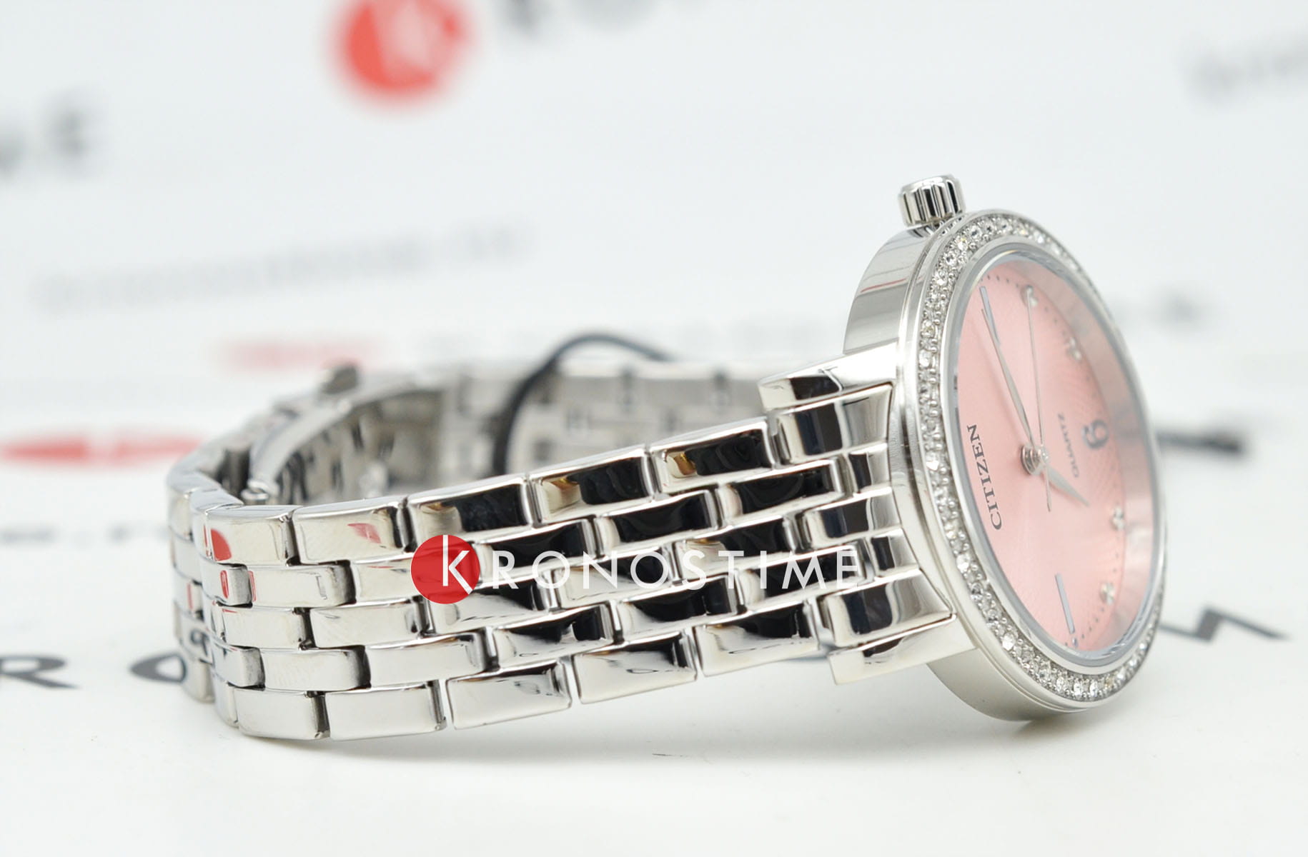 Часы Citizen EL3100-55W представляют собой элегантную модель, выполненную в Японии, сочетающую в себе современные технологии и утончённый дизайн. Корпус и браслет изготовлены из прочной нержавеющей стали, что обеспечивает долговечность и привлекательный внешний вид. Диаметр корпуса составляет 31 мм, а толщина — всего 7 мм, что делает часы изящными и аккуратными на запястье. Особое внимание привлекает безельБезельВнешний ободок, закрепляющий стекло. В спортивных часах так называется поворотное кольцо с делениями на циферблате, выполняет роль таймера – замеряет отрезки времени на шкале. Неподвижный безель – элемент декора. Однонаправленно вращающийся безель на дайверских часах позволяет фиксировать моменты погружения и выныривания на поверхность., украшенный мерцающими кристаллами, которые придают часам особый шарм и изысканность. Надёжный кварцевый механизм гарантирует точность хода, а водозащита уровня WR 50 позволяет не снимать часы при мытье рук или во время дождя. Нежно-розовый циферблат украшен часовыми индексами в виде точек и цифр, а также оснащён центральными стрелками часов, минут и секунд для удобного считывания времени и кристаллами. Минеральное стеклоМинеральное стеклоМинеральное стекло представляет собой искусственно выращенный минерал кварца. Такое стекло отличается особой устойчивостью к повреждениям и царапинам. Уступает по некоторым качествам сапфировому стеклу. устойчиво к появлению мелких царапин, сохраняя прозрачность и презентабельный вид. Стальной браслет с раскладной застёжкойРаскладная застёжкаТакой тип застёжки используется только на браслетах из металла. Она никогда не раскрывается полностью, происходит разделение на 2 и более частей. Раскладывающая застёжка снизит вероятность потери часов к минимуму. надежно фиксирует часы на запястье, обеспечивая комфорт при ежедневном ношении.