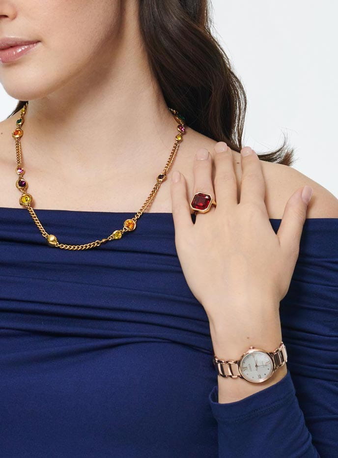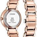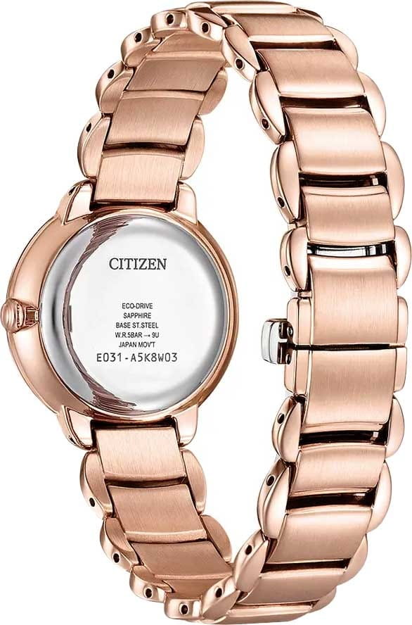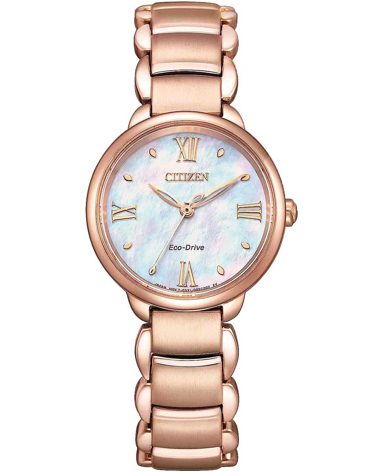 Часы Citizen EM0928-84D произведены в Японии и оснащены точным кварцевым механизмом калибра Citizen E031 с инновационной системой Eco-Drive, работающей от солнечной энергии и обеспечивающей до 180 дней автономной работы без замены батареек. Корпус и браслет изготовлены из прочной нержавеющей стали с золотистым IP-покрытиемIP-покрытиеМетод ионного напыления. Демонстрирует повышенную устойчивость к истиранию, окислению и химическим веществам. Под воздействием высокого давления и температуры около 1500°C молекулы металла надёжно соединяются с частицами корпуса часов., что придает изделию элегантный и современный вид, а браслет оснащен удобной застежкой «бабочка»Застёжка "бабочка"Такой вид застёжки дополняется предохранителями, помогающими избежать случайного раскрытия браслета. Обладают изящным исполнением. . Перламутровый циферблат украшен изящными метками в виде точек и римских цифр, защищён надежным сапфировым стекломСапфировое стеклоПрочный и надёжный материал из кристалла сапфира синтетического происхождения, характеризующийся особой твёрдостью и устойчивостью к царапинам и повреждениям., устойчивым к царапинам. Водозащита 50WR позволяет не беспокоиться о контакте с водой в повседневной жизни. Компактные размеры корпуса (диаметр 28 мм, толщина 8 мм) и легкий вес (68 г) обеспечивают комфортное ношение в течение всего дня. Эта модель станет не только точным инструментом для измерения времени, но и стильным завершением вашего образа.