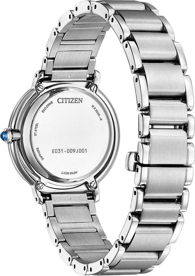 Элегантные часы Citizen EM1100-84H произведены в Японии и оснащены современным кварцевым механизмом Citizen E031 с инновационной системой Eco-Drive, которая использует энергию солнечного света и не требует замены батарейки, обеспечивая до 180 дней работы в автономном режиме. Корпус и браслет выполнены из высококачественной нержавеющей стали, что гарантирует долговечность и износостойкость. Перламутровый черный циферблат с изящными штриховыми метками защищён выпуклым сапфировым стекломСапфировое стеклоПрочный и надёжный материал из кристалла сапфира синтетического происхождения, характеризующийся особой твёрдостью и устойчивостью к царапинам и повреждениям., устойчивым к царапинам. БезельБезельВнешний ободок, закрепляющий стекло. В спортивных часах так называется поворотное кольцо с делениями на циферблате, выполняет роль таймера – замеряет отрезки времени на шкале. Неподвижный безель – элемент декора. Однонаправленно вращающийся безель на дайверских часах позволяет фиксировать моменты погружения и выныривания на поверхность. часов декорирован алмазной гранью, а заводная головка украшена камнем в форме кабошона, что придаёт модели особый шарм. Задняя крышка закреплена на четырёх винтах, что повышает надёжность конструкции. Часы имеют водозащиту до 50 метров, а также функцию индикации заряда и предотвращения перезарядки. Размер корпуса составляет 31,2 мм в диаметре и 8 мм в толщину, вес — 71 грамм. Застежка «бабочка»Застёжка "бабочка"Такой вид застёжки дополняется предохранителями, помогающими избежать случайного раскрытия браслета. Обладают изящным исполнением. у браслета обеспечивает комфортное и надёжное ношение. Эта модель идеально подчеркнёт изысканный стиль и индивидуальность своей обладательницы.
