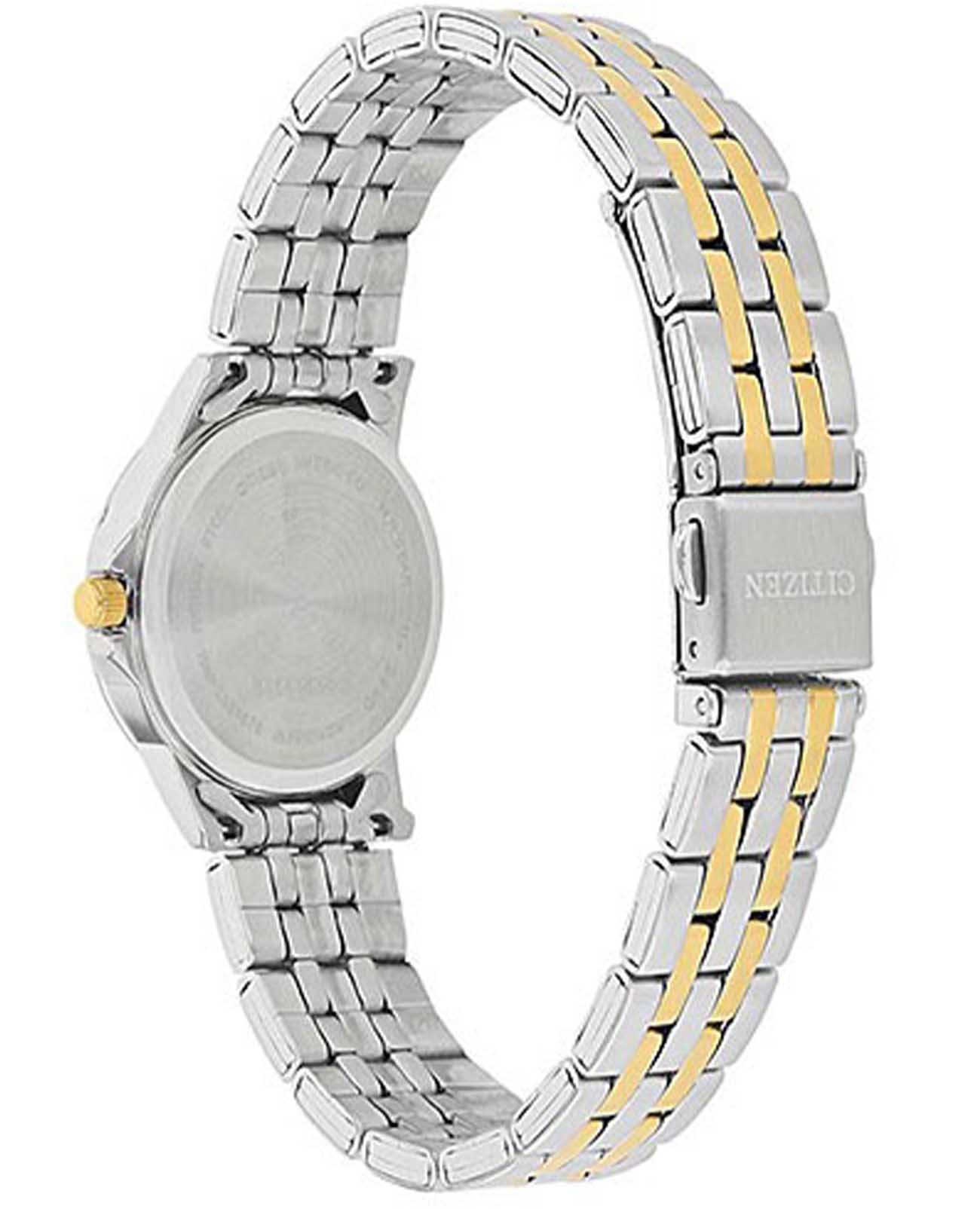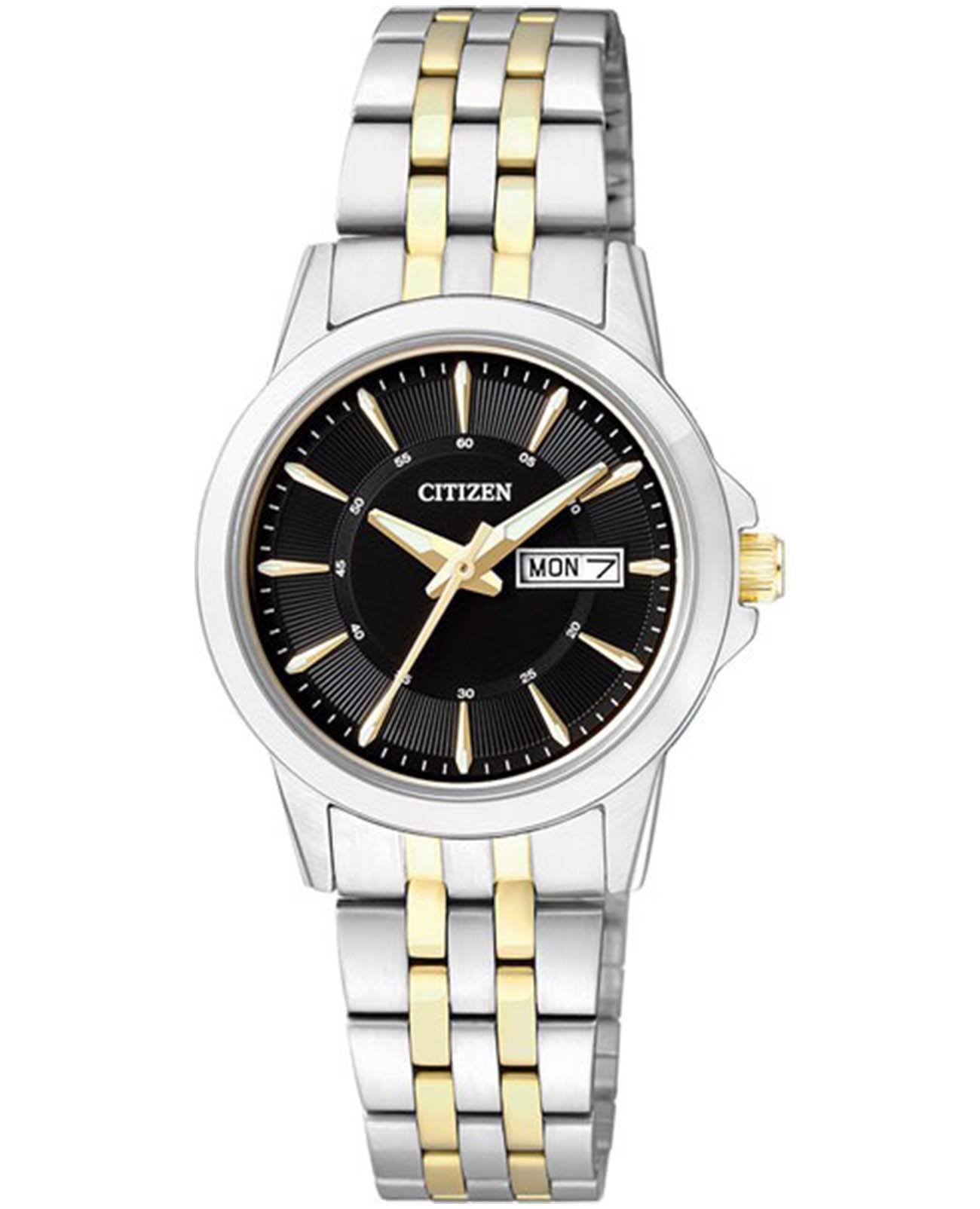 Часы Citizen EQ0608-55E выполнены в классическом стиле и станут отличным выбором для тех, кто ценит элегантность и надежность в каждом элементе. Модель оснащена точным японским кварцевым механизмом Citizen 1002, обеспечивающим стабильную работу и точный ход. Корпус диаметром 28 мм и толщиной 8 мм изготовлен из нержавеющей стали, что придаёт часам благородный оттенок и долговечность. Браслет, выполненный из стали с частичным золотистым IP-покрытиемIP-покрытиеМетод ионного напыления. Демонстрирует повышенную устойчивость к истиранию, окислению и химическим веществам. Под воздействием высокого давления и температуры около 1500°C молекулы металла надёжно соединяются с частицами корпуса часов. и оснащённый раскладной застёжкойРаскладная застёжкаТакой тип застёжки используется только на браслетах из металла. Она никогда не раскрывается полностью, происходит разделение на 2 и более частей. Раскладывающая застёжка снизит вероятность потери часов к минимуму. с системой блокировки, обеспечивает надежную фиксацию на запястье. Циферблат черного цвета украшен стрелками с люминесцентным покрытиемЛюминесцентное покрытиеПозволяет считывать показания времени в темноте. Производители наносят на стрелки, часовые индексы, безель или поверхность циферблата светонакопительный состав, дающий холодное свечение. для удобного считывания времени даже в условиях недостаточного освещения. Минеральное стеклоМинеральное стеклоМинеральное стекло представляет собой искусственно выращенный минерал кварца. Такое стекло отличается особой устойчивостью к повреждениям и царапинам. Уступает по некоторым качествам сапфировому стеклу. защищает часы от случайных царапин, а водозащита уровня 30WR позволяет не бояться случайных брызг или дождя. На циферблате также расположен календарь с отображением даты и дня недели, что делает модель ещё более функциональной. Заводная головка снабжена защитой, что повышает комфорт и безопасность использования.
