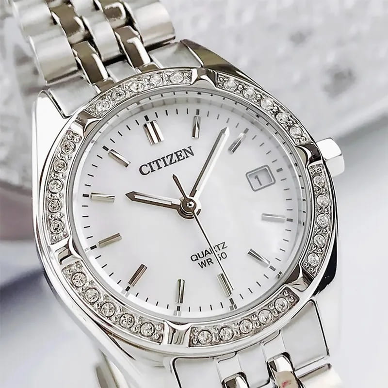 Часы Citizen EU6060-55D представляют собой элегантную модель, выполненную в Японии, сочетающую в себе современные технологии и утончённый дизайн. Корпус и браслет изготовлены из прочной нержавеющей стали, что обеспечивает долговечность и привлекательный внешний вид. Диаметр корпуса составляет 26 мм, что делает часы изящными и аккуратными на запястье. Особое внимание привлекает безельБезельВнешний ободок, закрепляющий стекло. В спортивных часах так называется поворотное кольцо с делениями на циферблате, выполняет роль таймера – замеряет отрезки времени на шкале. Неподвижный безель – элемент декора. Однонаправленно вращающийся безель на дайверских часах позволяет фиксировать моменты погружения и выныривания на поверхность., украшенный мерцающими кристаллами, которые придают часам особый шарм и изысканность. Стрелки с люминесцентным покрытиемЛюминесцентное покрытиеПозволяет считывать показания времени в темноте. Производители наносят на стрелки, часовые индексы, безель или поверхность циферблата светонакопительный состав, дающий холодное свечение.. Надёжный кварцевый механизм гарантирует точность хода, а водозащита уровня WR 50 позволяет не снимать часы при мытье рук или во время дождя. Циферблат украшен часовыми индексами в виде штрихов, а также оснащён окошком даты в позиции 3 часа, центральными стрелками часов, минут и секунд для удобного считывания времени и кристаллами. Минеральное стеклоМинеральное стеклоМинеральное стекло представляет собой искусственно выращенный минерал кварца. Такое стекло отличается особой устойчивостью к повреждениям и царапинам. Уступает по некоторым качествам сапфировому стеклу. устойчиво к появлению мелких царапин, сохраняя прозрачность и презентабельный вид. Стальной браслет с раскладной застёжкойРаскладная застёжкаТакой тип застёжки используется только на браслетах из металла. Она никогда не раскрывается полностью, происходит разделение на 2 и более частей. Раскладывающая застёжка снизит вероятность потери часов к минимуму. надежно фиксирует часы на запястье, обеспечивая комфорт при ежедневном ношении.