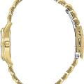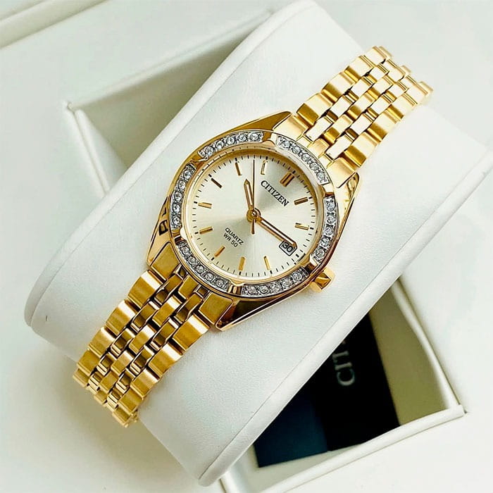 Элегантные часы Citizen EU6062-50P сочетают в себе изысканный дизайн и надежность японского качества. Круглый корпус диаметром 26 мм изготовлен из нержавеющей стали с PVD-покрытиемPVDУльтратонкое покрытие наносится в технике вакуумного напыления, сочетает в себе нитрид титана особой прочности со слоем золота или оксида хрома. Несёт в себе декоративную или защитную функцию. цвета желтого золота и украшен сверкающими кристаллами по безелюБезельВнешний ободок, закрепляющий стекло. В спортивных часах так называется поворотное кольцо с делениями на циферблате, выполняет роль таймера – замеряет отрезки времени на шкале. Неподвижный безель – элемент декора. Однонаправленно вращающийся безель на дайверских часах позволяет фиксировать моменты погружения и выныривания на поверхность., что придает модели утонченный вид. Циферблат цвета шампань дополнен центральными стрелками и апертурой даты на позиции 3 часов. Минеральное стеклоМинеральное стеклоМинеральное стекло представляет собой искусственно выращенный минерал кварца. Такое стекло отличается особой устойчивостью к повреждениям и царапинам. Уступает по некоторым качествам сапфировому стеклу. защищает от мелких повреждений, а стальной браслет с раскладной застёжкойРаскладная застёжкаТакой тип застёжки используется только на браслетах из металла. Она никогда не раскрывается полностью, происходит разделение на 2 и более частей. Раскладывающая застёжка снизит вероятность потери часов к минимуму. обеспечивает комфортную посадку. Стрелки с люминесцентным покрытиемЛюминесцентное покрытиеПозволяет считывать показания времени в темноте. Производители наносят на стрелки, часовые индексы, безель или поверхность циферблата светонакопительный состав, дающий холодное свечение. для отличной читаемости в любое время суток. Благодаря водостойкости WR 50 часы подходят для повседневного ношения, включая мытье рук и дождь.