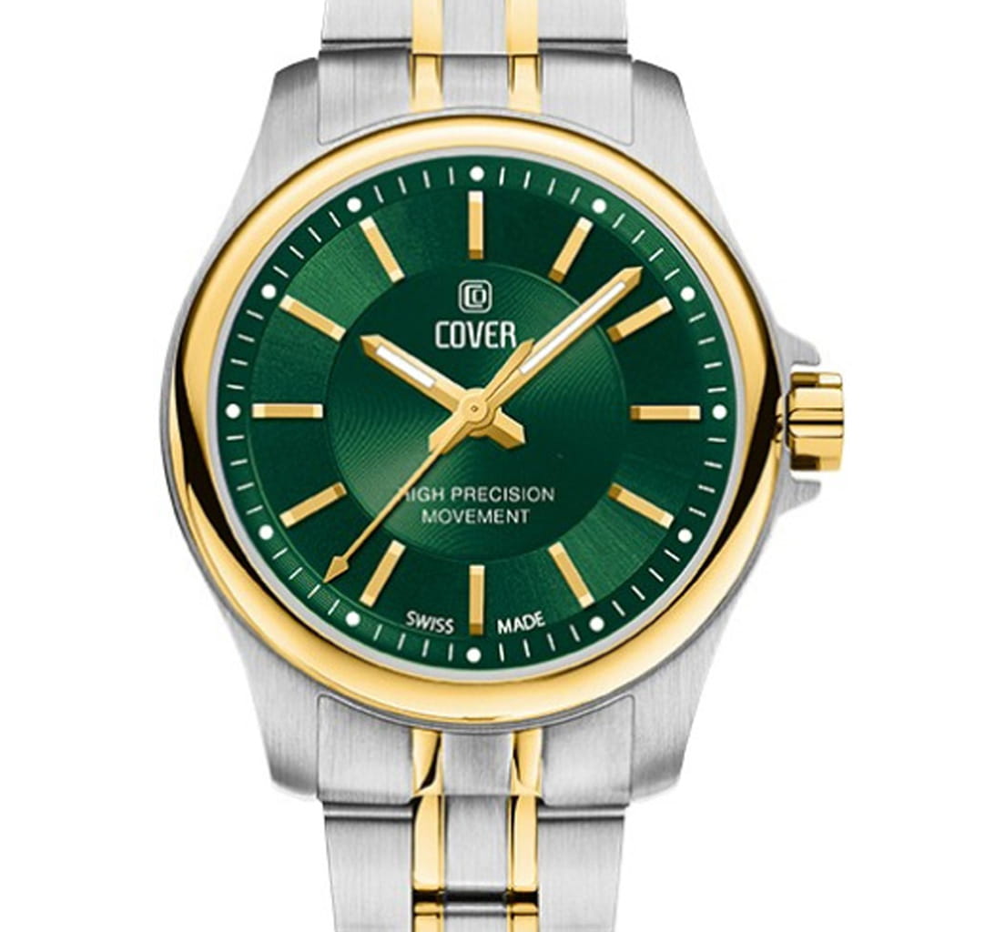 Женские наручные часы Cover CO201.32 из коллекции Marville сочетают в себе классический дизайн и высокую точность швейцарского производства. Модель обладает круглым корпусом диаметром 28 мм, изготовленным из нержавеющей стали, что придает изделию благородный внешний вид. Зеленый циферблат оснащен стрелками с люминесцентным покрытиемЛюминесцентное покрытиеПозволяет считывать показания времени в темноте. Производители наносят на стрелки, часовые индексы, безель или поверхность циферблата светонакопительный состав, дающий холодное свечение.. Для защиты используется сапфировое стеклоСапфировое стеклоПрочный и надёжный материал из кристалла сапфира синтетического происхождения, характеризующийся особой твёрдостью и устойчивостью к царапинам и повреждениям. с антибликовым покрытиемАнтибликовое покрытиеСлой оксида металла в 0,13-0,3 микрон, благодаря которому стекло часов не бликует и не отражает свет. Антибликовое покрытие уменьшает отражение света в 10 раз, обеспечивая отличную читаемость показателей циферблата., обеспечивающее прочную защиту от царапин и превосходную читаемость времени даже при ярком свете. БезельБезельВнешний ободок, закрепляющий стекло. В спортивных часах так называется поворотное кольцо с делениями на циферблате, выполняет роль таймера – замеряет отрезки времени на шкале. Неподвижный безель – элемент декора. Однонаправленно вращающийся безель на дайверских часах позволяет фиксировать моменты погружения и выныривания на поверхность. с золотистым PVD-покрытиемPVDУльтратонкое покрытие наносится в технике вакуумного напыления, сочетает в себе нитрид титана особой прочности со слоем золота или оксида хрома. Несёт в себе декоративную или защитную функцию.. Часы работают на высокоточном кварцевом механизме ETA, гарантирующем исключительную точность хода с погрешностью около 20 секунд в месяц. Браслет выполнен из нержавеющей стали с частичным PVD-покрытиемPVDУльтратонкое покрытие наносится в технике вакуумного напыления, сочетает в себе нитрид титана особой прочности со слоем золота или оксида хрома. Несёт в себе декоративную или защитную функцию. и оснащен раскладной застежкойРаскладная застёжкаТакой тип застёжки используется только на браслетах из металла. Она никогда не раскрывается полностью, происходит разделение на 2 и более частей. Раскладывающая застёжка снизит вероятность потери часов к минимуму., обеспечивающей комфортное ношение и безопасность. Водонепроницаемость достигает 10 атмосфер (100 метров), что позволяет использовать их во время плавания и других водных видов спорта, однако не рекомендуется для глубоководного дайвинга. Эти швейцарские часы станут идеальным дополнением как классического, так и современного образа.