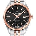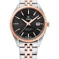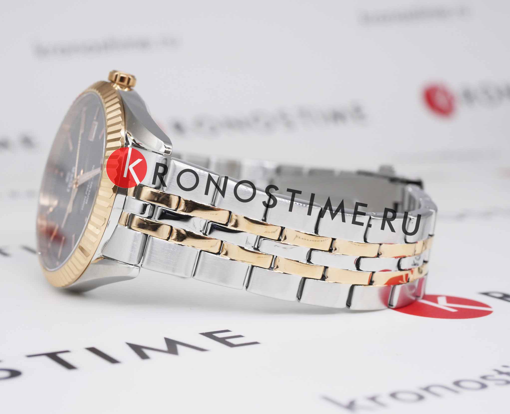Циферблат черного цвета с текстурированным узором и контрастными штрихами, защищен минеральным стекломМинеральное стеклоМинеральное стекло представляет собой искусственно выращенный минерал кварца. Такое стекло отличается особой устойчивостью к повреждениям и царапинам. Уступает по некоторым качествам сапфировому стеклу. с сапфировым напылением. Браслет из нержавеющей стали с частичным PVD-покрытиемPVDУльтратонкое покрытие наносится в технике вакуумного напыления, сочетает в себе нитрид титана особой прочности со слоем золота или оксида хрома. Несёт в себе декоративную или защитную функцию. цвета розового золота.